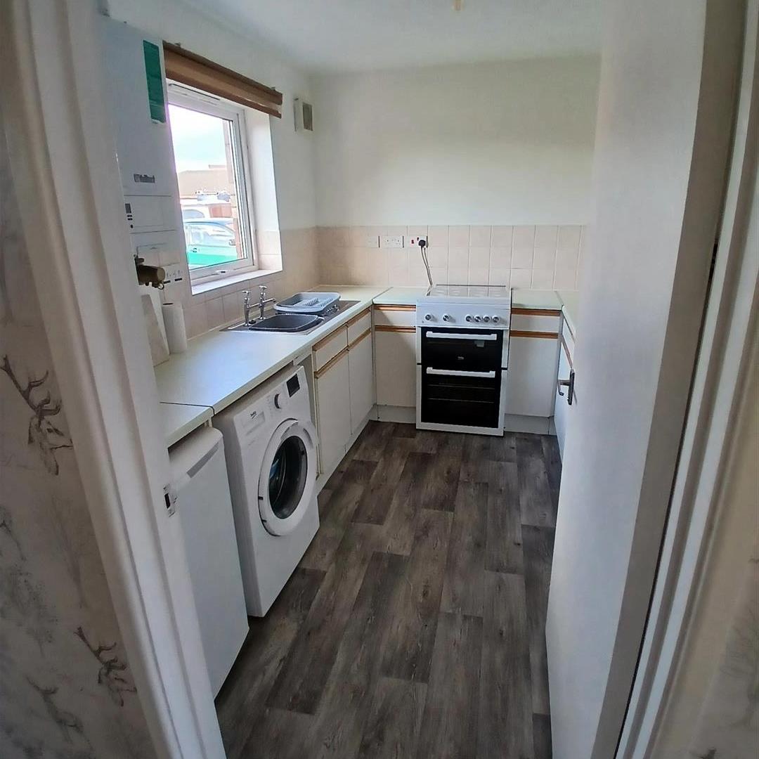 Fitted with a range of base and wall units with work surfaces and inset sink and drainer unit. Cooker, fridge and freezer. And washing machine. Tiled splash backs. Wall mounted gas boiler, extractor fan, window to the front elevation.
