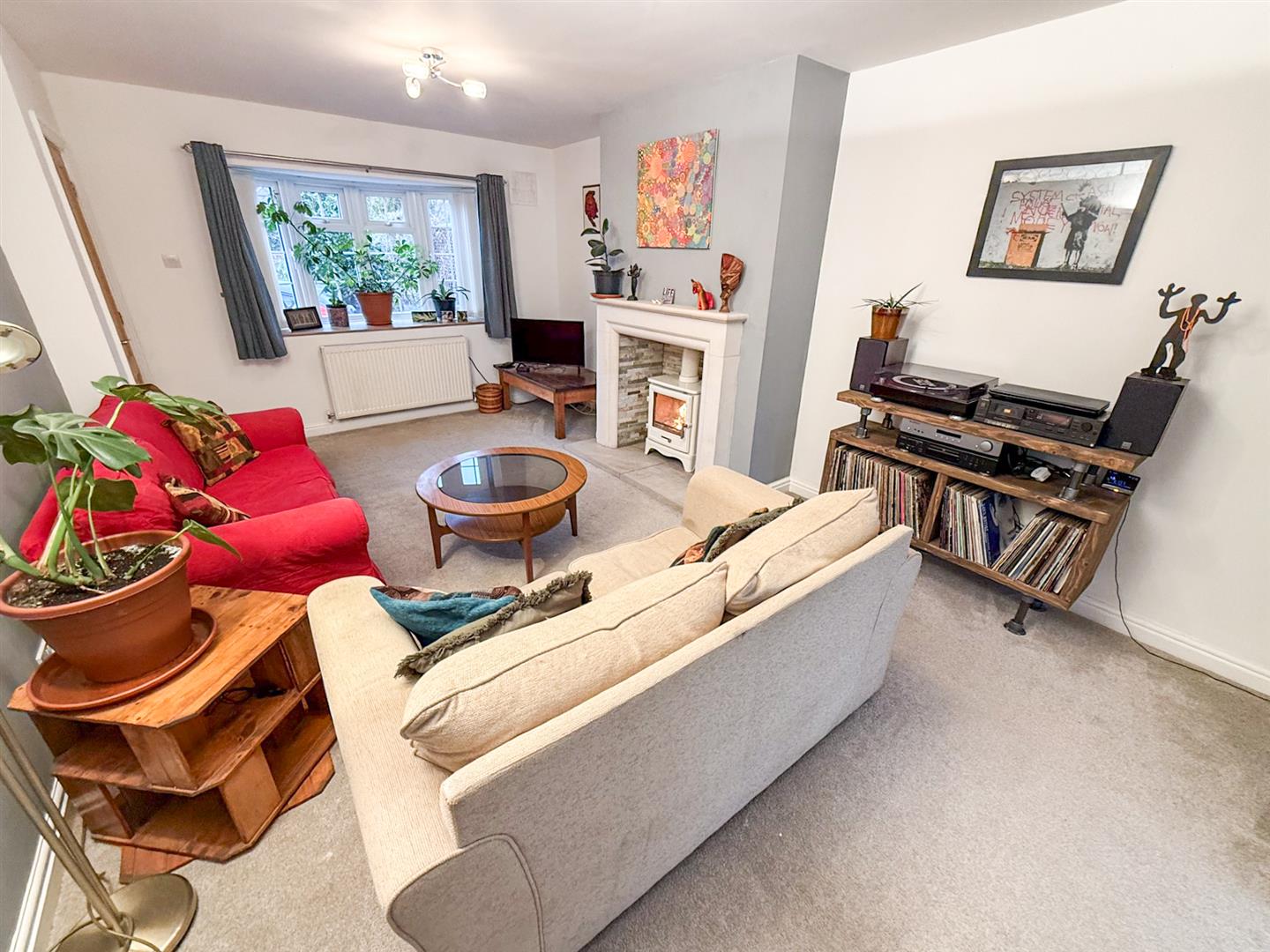 A lovely generous room, with a bow window to the front overlooking the front garden, radiator, built-in shelving, stone fireplace with stone-tiled hearth and inglenook with eco wood-burner inset, TV point, and French doors leading through to the conservatory letting in plenty of light.