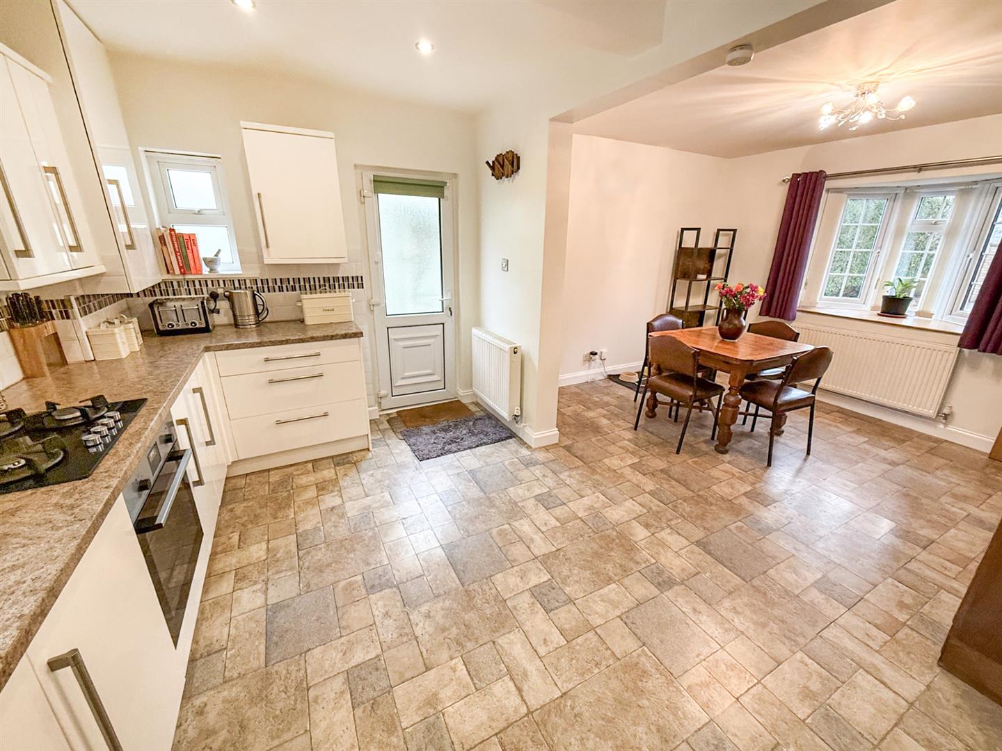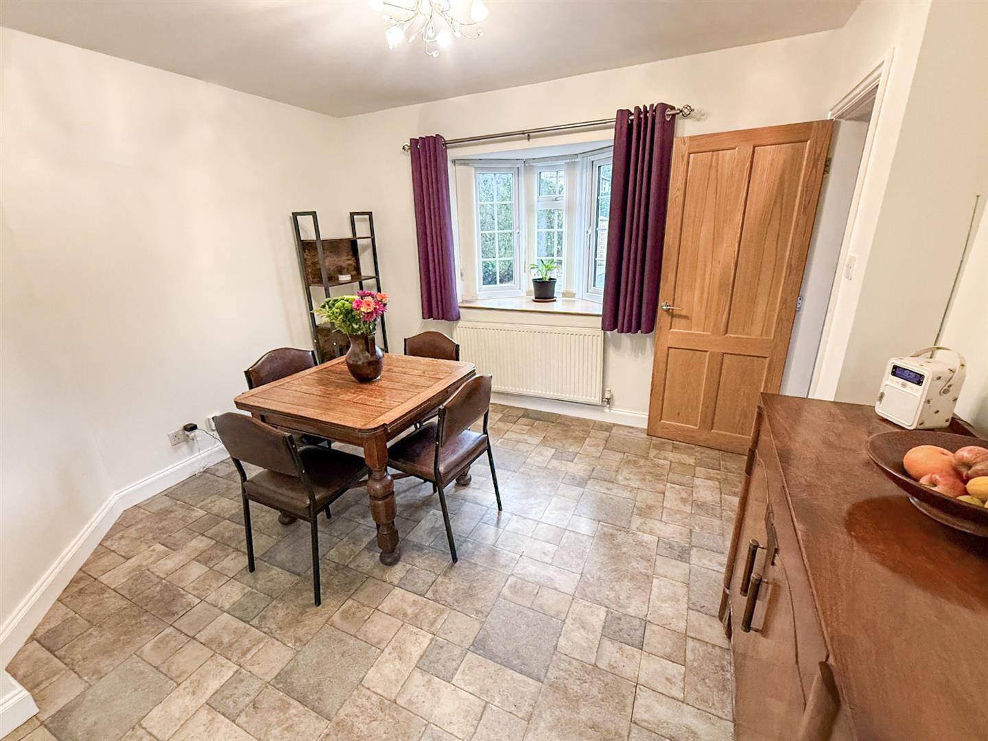 The dining and kitchen area is a fantastic space for families and entertaining, with a bow window to the front, radiator, and tile-effect laminate flooring. This generous space easily fits a large dining table and snug furniture. An archway leads through to the kitchen.