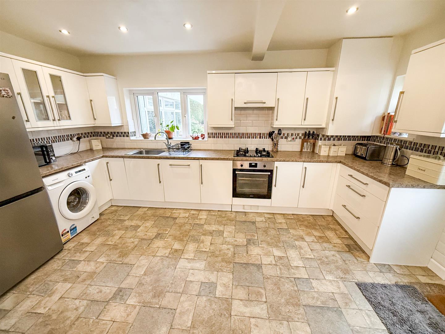 Having a window to the rear overlooking the garden and a further window to the side, fitted with a large range of base and wall units and an understairs cupboard providing additional storage. There is space and plumbing for a washing machine, and included is an integral dishwasher and recently fitted electric oven and gas hob with integral extractor fan. There is a stainless-steel single sink with mixer tap, space for a large fridge-freezer, tile-effect laminate flooring, part-tiled walls, and spotlighting. From the kitchen, a part-glazed door to the side exits into the garden.