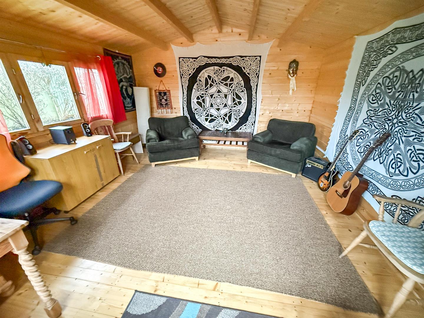 A very versatile space with mains electricity. Used by the current owners for yoga, music and art, or just to sit and listen to the birds and drink in the view, this is a wonderful place to find peace and quiet. With double doors opening up to a decking and cottage garden, and looking across to Forster’s Meadow, Watt’s Dyke Way, the River Perry and the rising sun, this is a recommended spot for breakfast! This peaceful space makes a great summerhouse, office or studio.