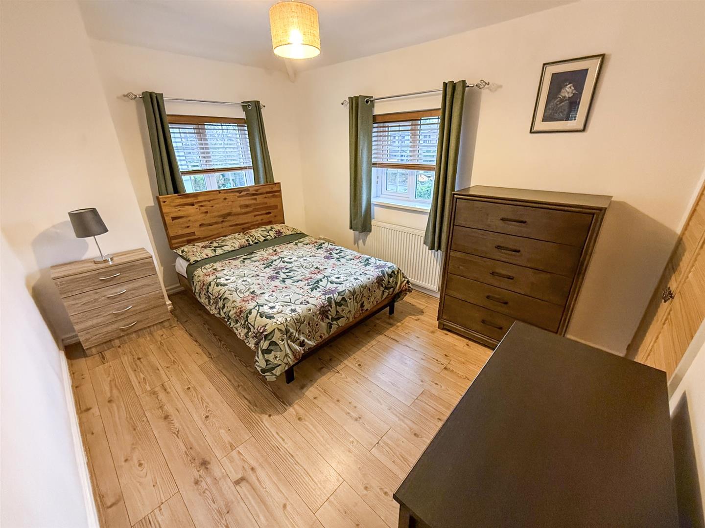 A large double room with dual aspect windows to the front and to the side letting in plenty of light, with a radiator, wood flooring and a large walk-in cupboard with lighting.