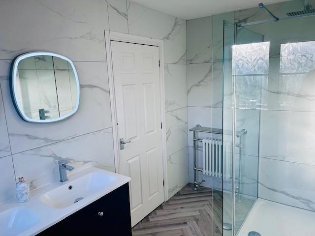 The ensuite has a window to the rear, W/C, twin wash hand basins, shower cubicle with rainfall shower, de-mist mirrors, a featured heated towel rail and fully tiled walls.