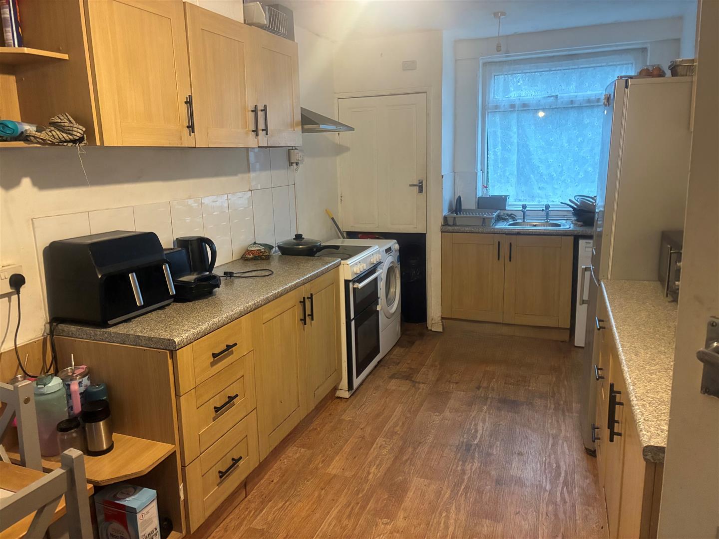 A fitted kitchen with a range of base, wall and drawer units with complimentary working surfaces and incorporating a single drainer sink unit with mixer tap over. window to the rear, laminate flooring to kitchen and dining area, double panelled radiator, 2 x ceiling light points, door to the rear garden.