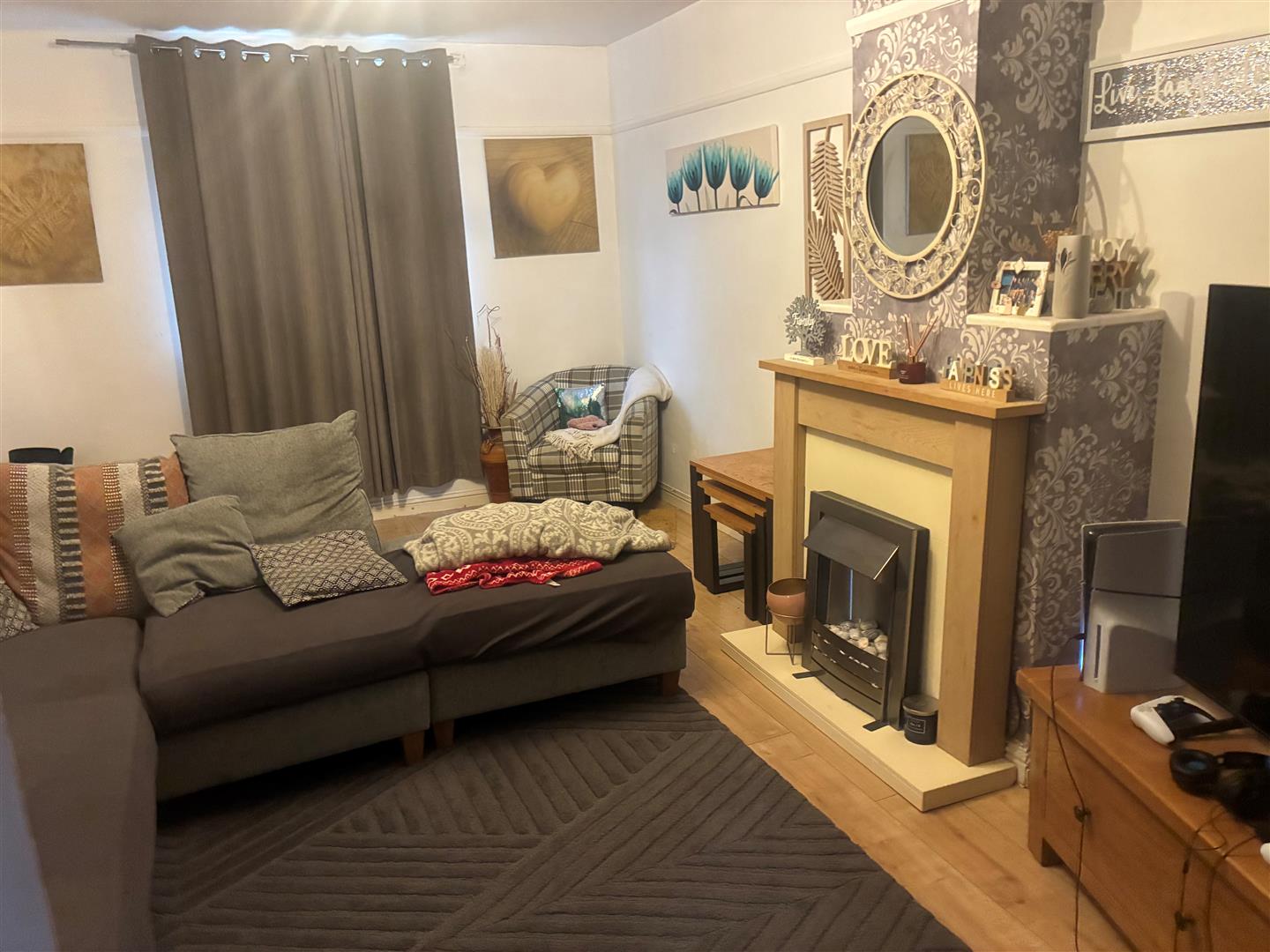With a window to the front, laminate flooring, ceiling light point, feature fireplace. Doors lead to the hallway and kitchen/diner.