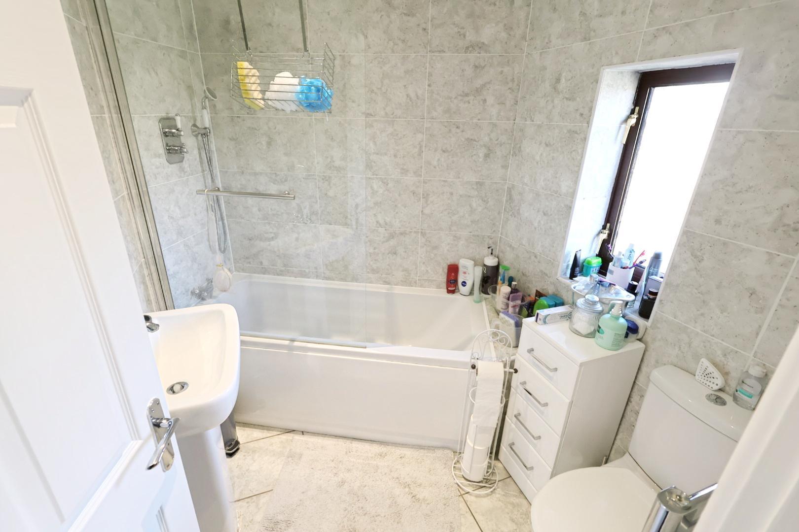 Fitted with a modern three-piece white suite comprising a panel bath with dual-head thermostatic shower and protective screen above, a dual flush low-level WC and pedestal wash hand basin. The room features a ceramic tiled floor, fully tiled walls, chrome heated towel rail, opaque window to the rear elevation, recessed ceiling downlights and an extractor fan.