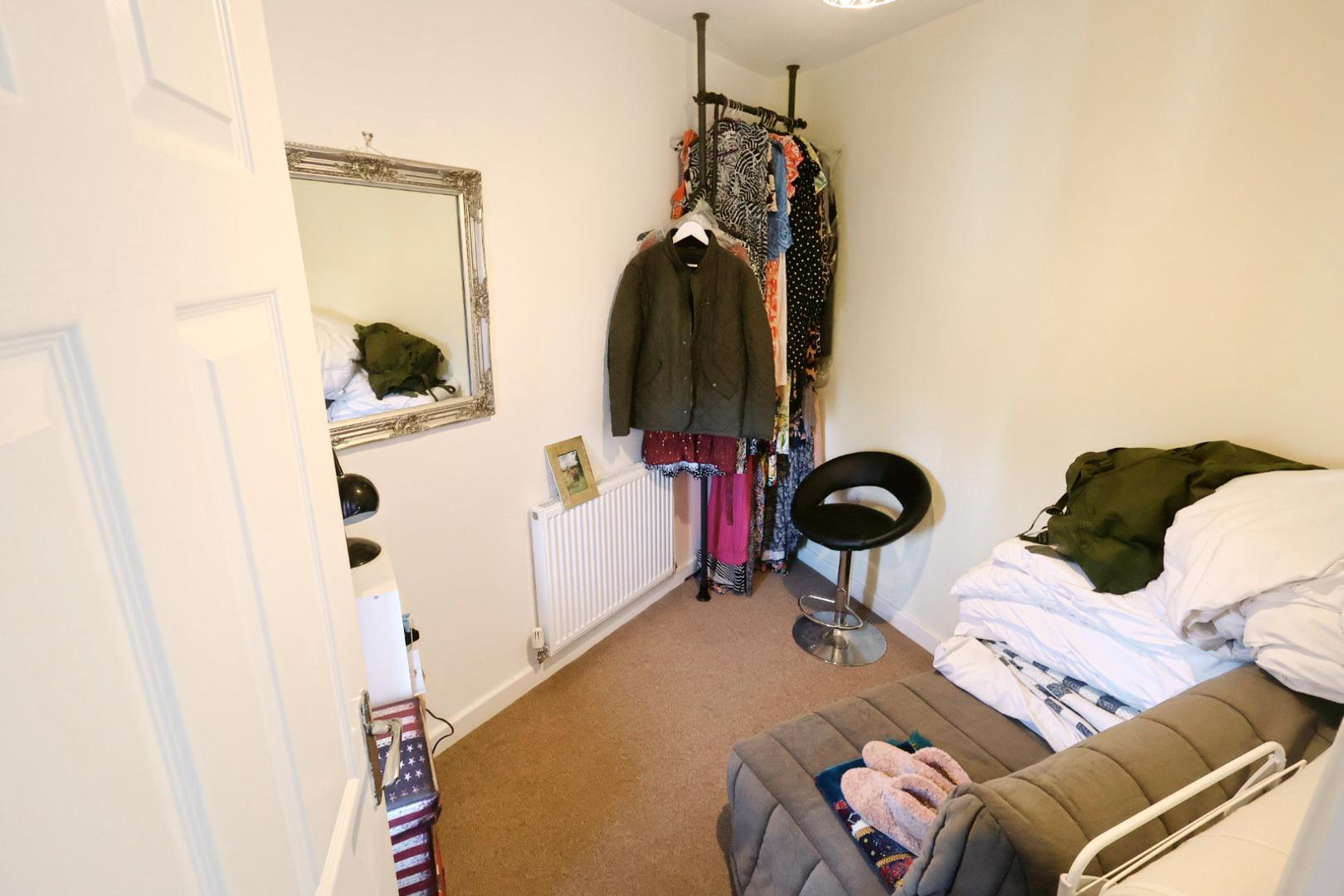 Featuring a built-in cupboard over the stairs, radiator, window to the front elevation and a built-in double wardrobe with sliding mirrored doors.
