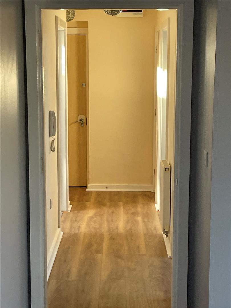 Entered through a wood grain-effect door, the entrance hall features an intercom system, a radiator, and doors leading to the open-plan living/kitchen area, both bedrooms, and the bathroom.