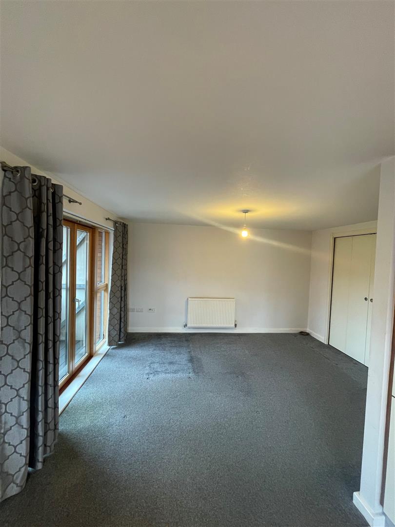The living room features a radiator, a large storage cupboard and an open through way into the kitchen/dining room and double glazed French doors which open to the balcony.