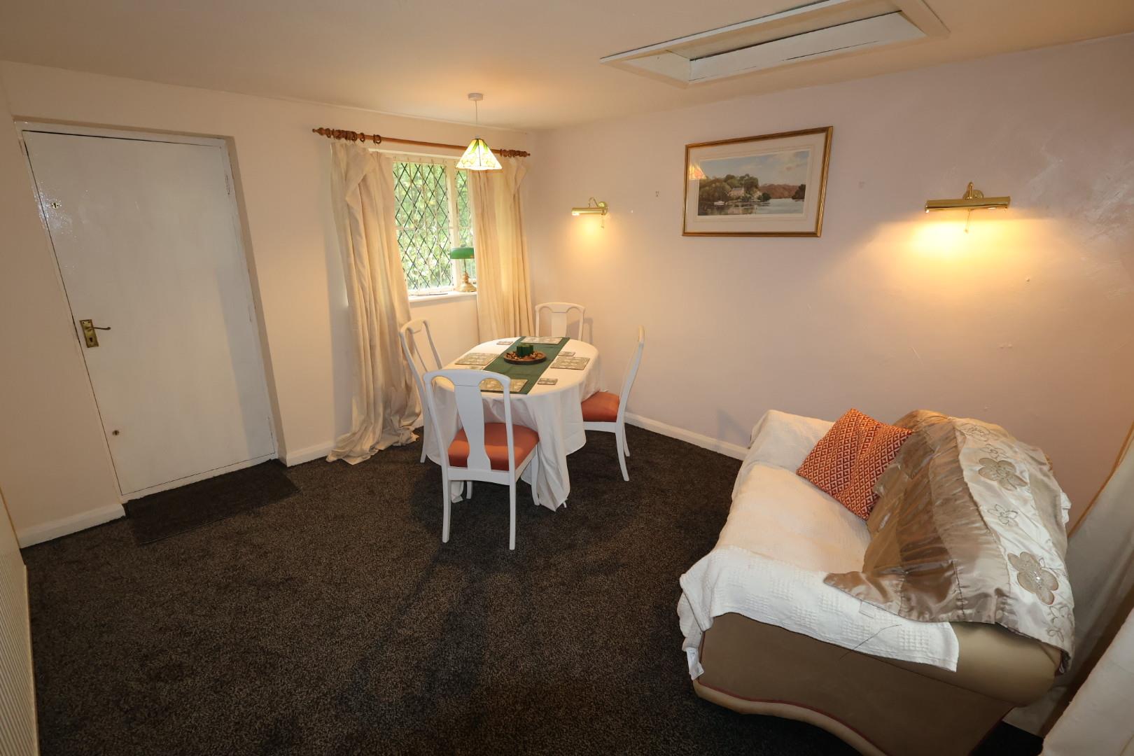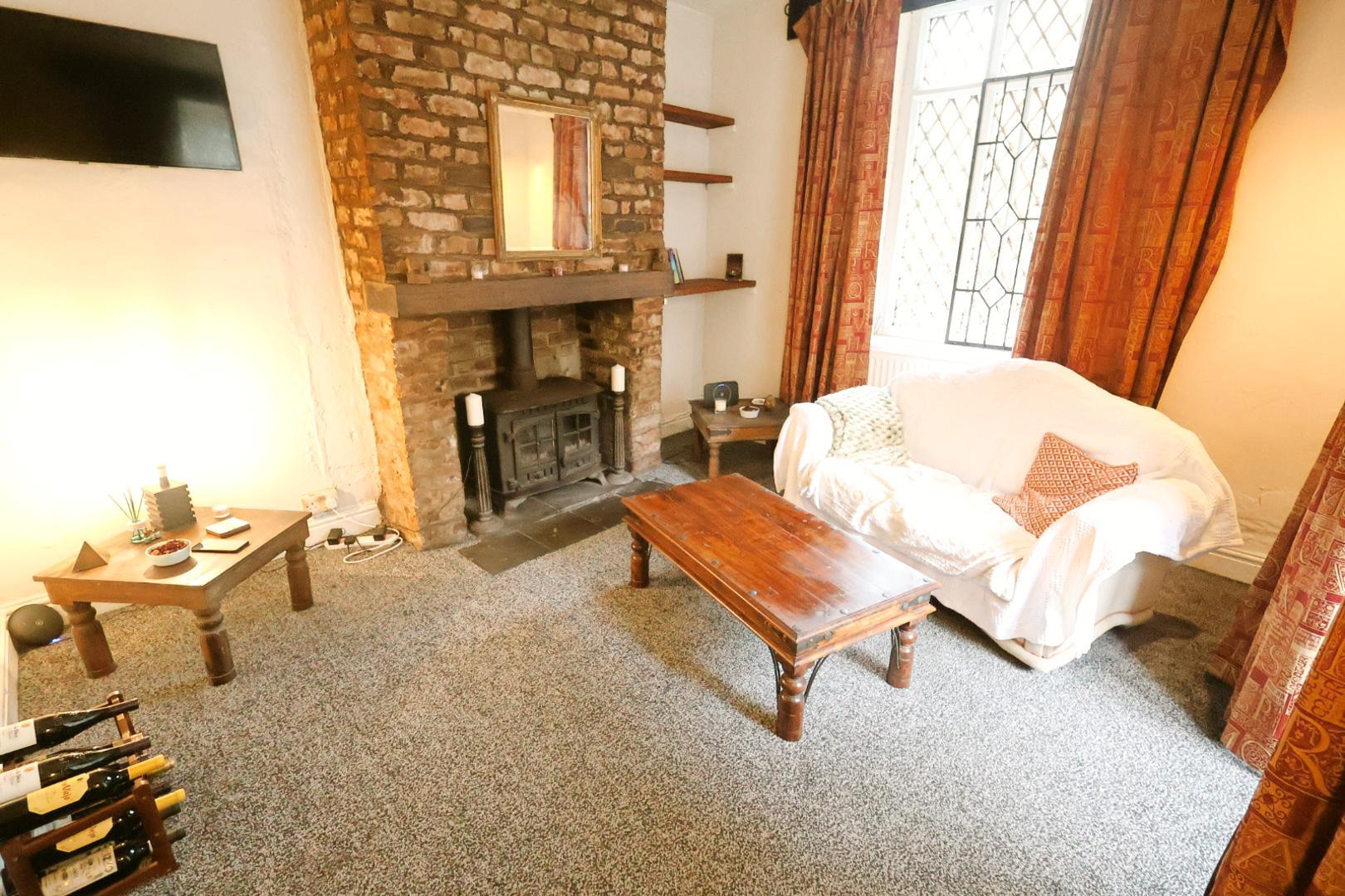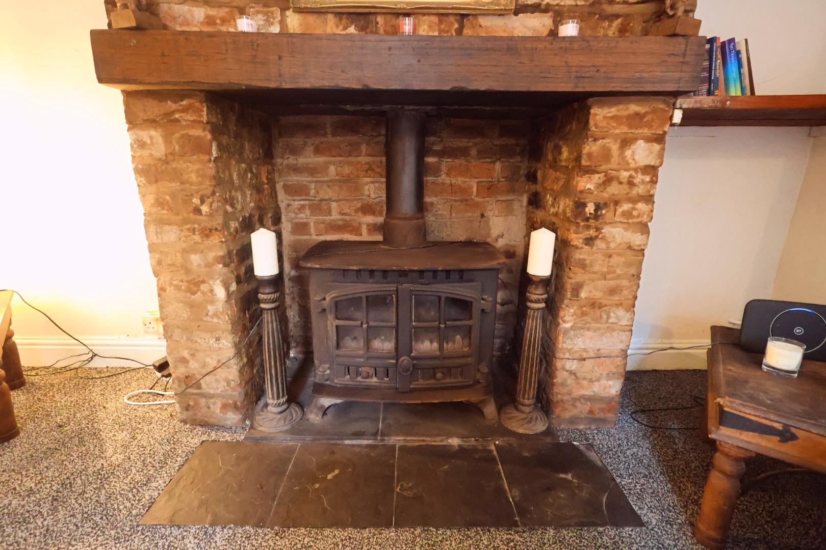 Bay window to the front elevation and a second window to the side. Exposed brick flue with oak-beam mantel housing a cast-iron solid-fuel burner.