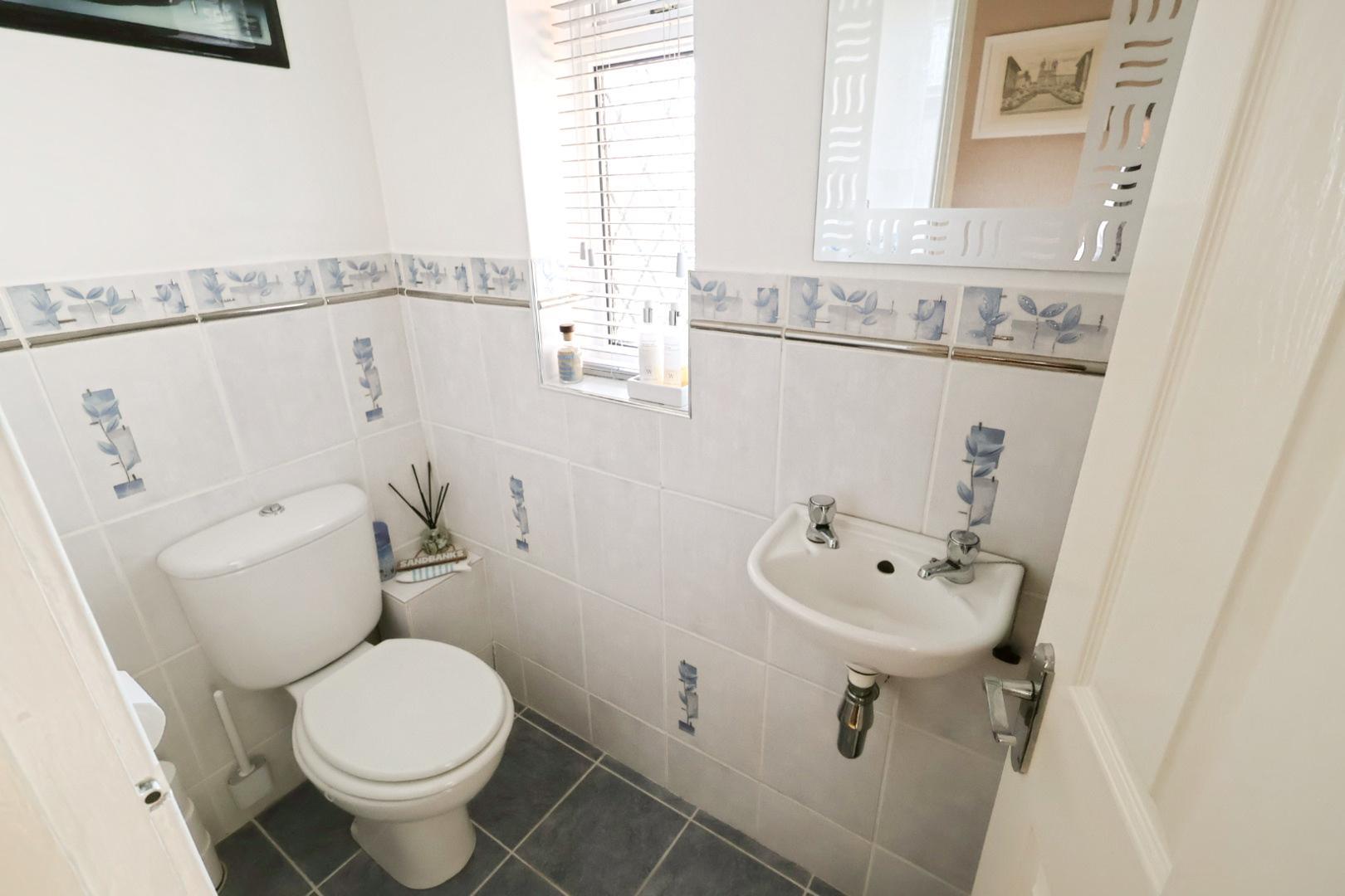 Fitted with a low-level WC and wall-mounted wash basin, complemented by tiled flooring and partially tiled walls.