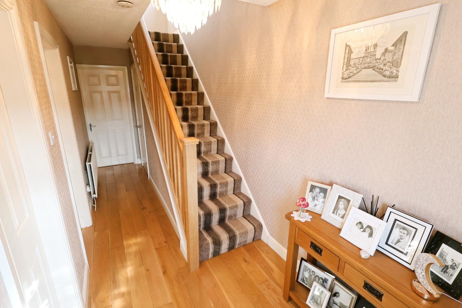 Entered via an opaque UPVC double glazed door, with engineered oak flooring, staircase to the first floor, and useful under-stairs storage cupboard.