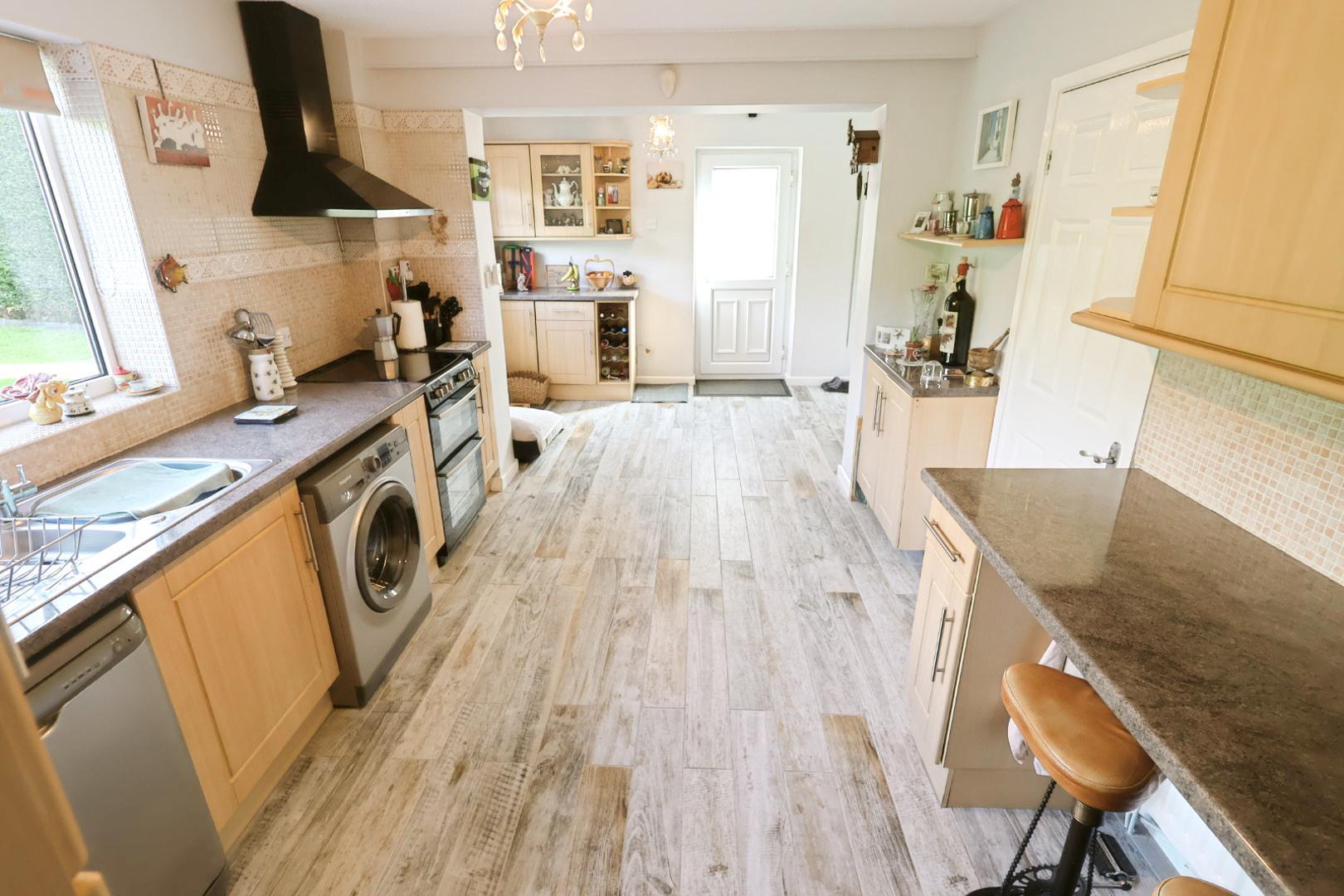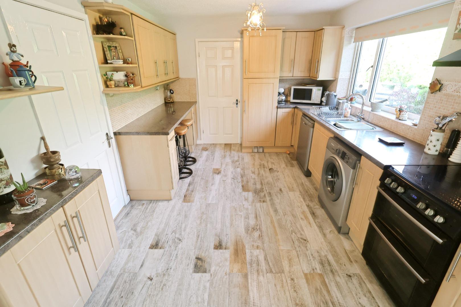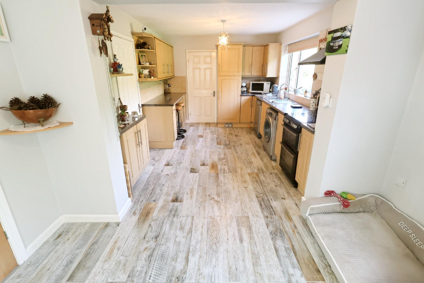 Fitted with a range of light wood grain units with work surfaces and breakfast bar. Includes integrated fridge freezer, sink unit, space for appliances, and tiled flooring. Access to the side and double doors leading into the dining room.