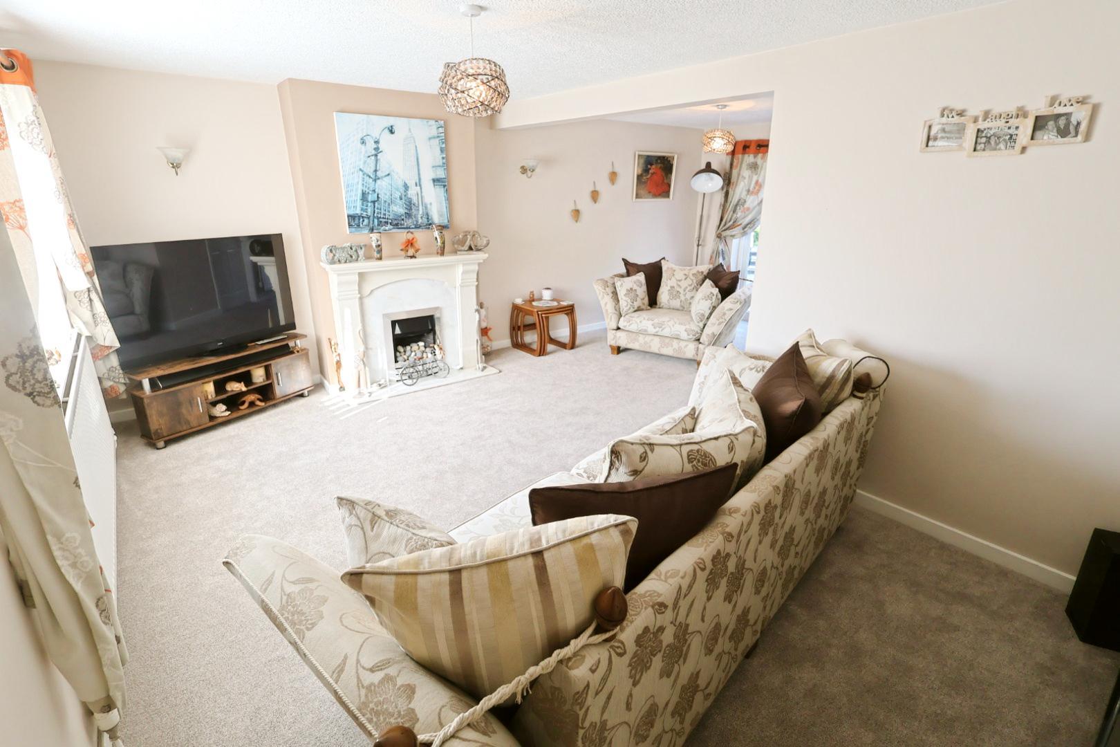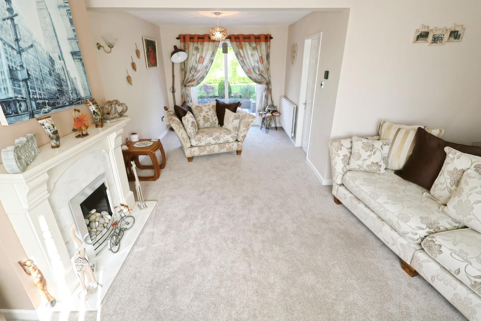A spacious and versatile L-shaped reception room with dual aspect, including a front-facing window and rear patio doors opening onto the garden. Features a decorative gas fire with marble surround.