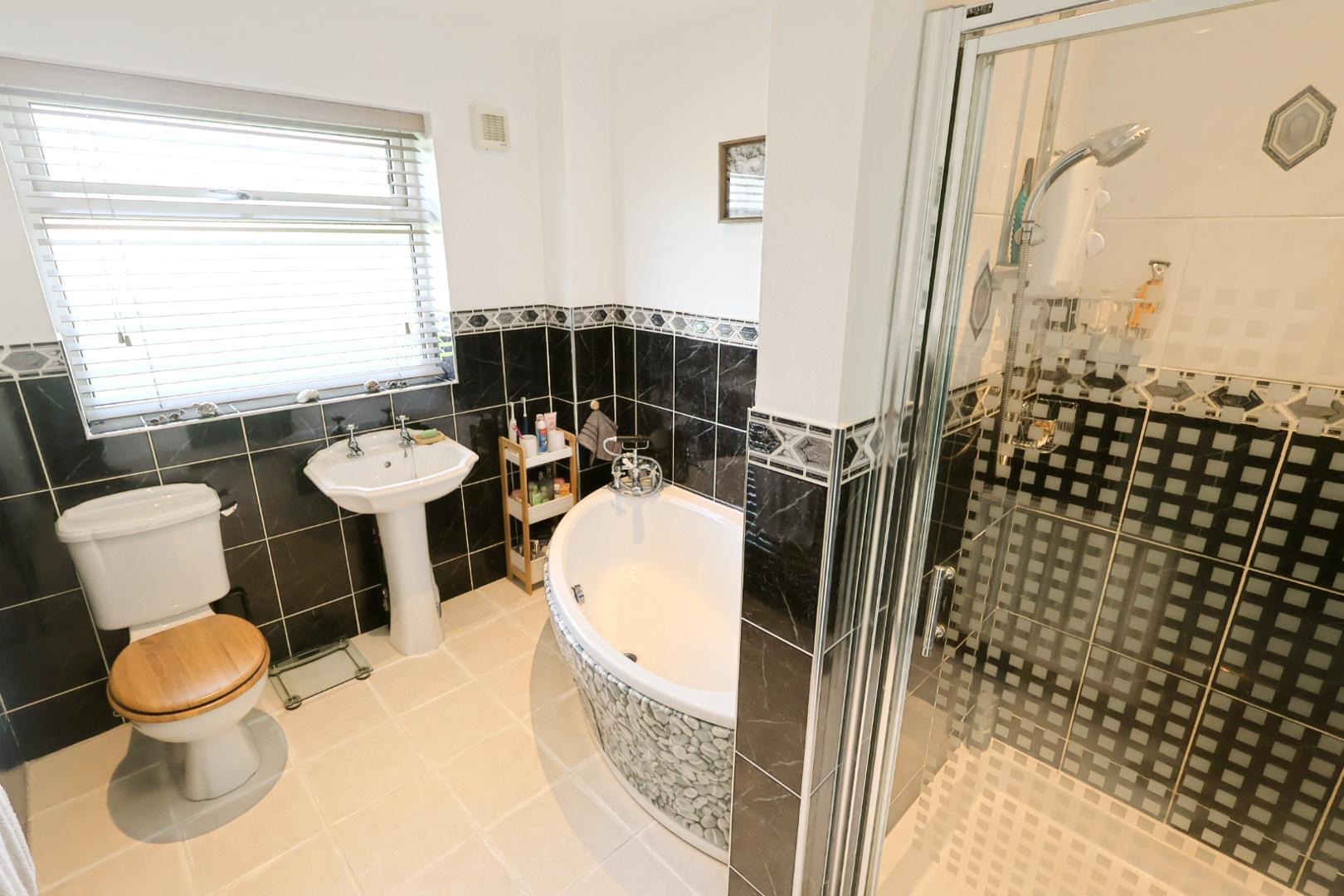 Appointed with a four-piece suite including corner bath, separate shower, WC, and pedestal basin, with tiled finishes and heated towel rail.