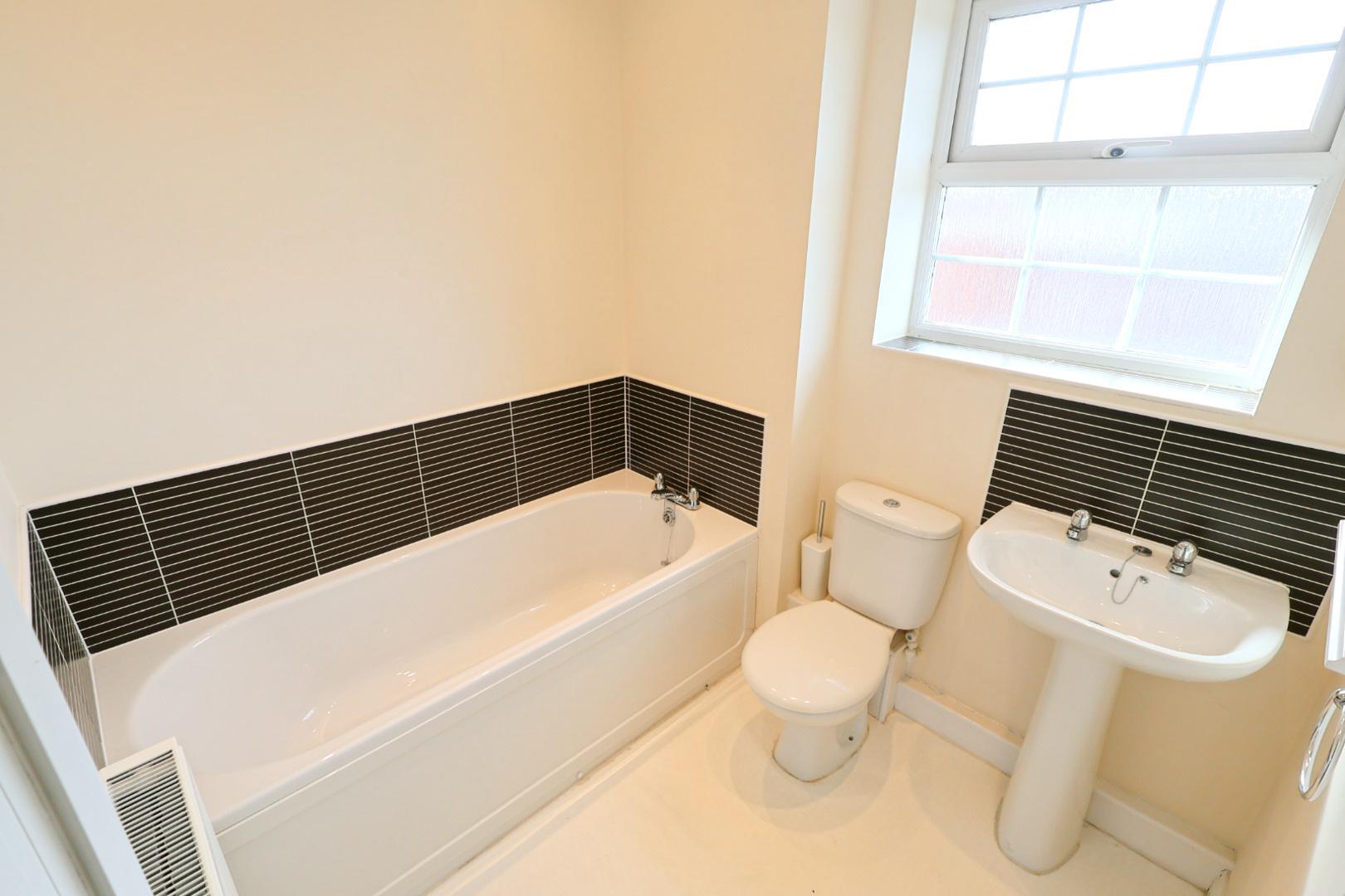Installed with a modern white suite comprising a panelled bath with mixer tap, a dual-flush low-level WC, and a pedestal wash hand basin. Partially tiled walls, a radiator, and an opaque window to the rear elevation complete the space, along with recessed downlights and an extractor fan in the ceiling.
