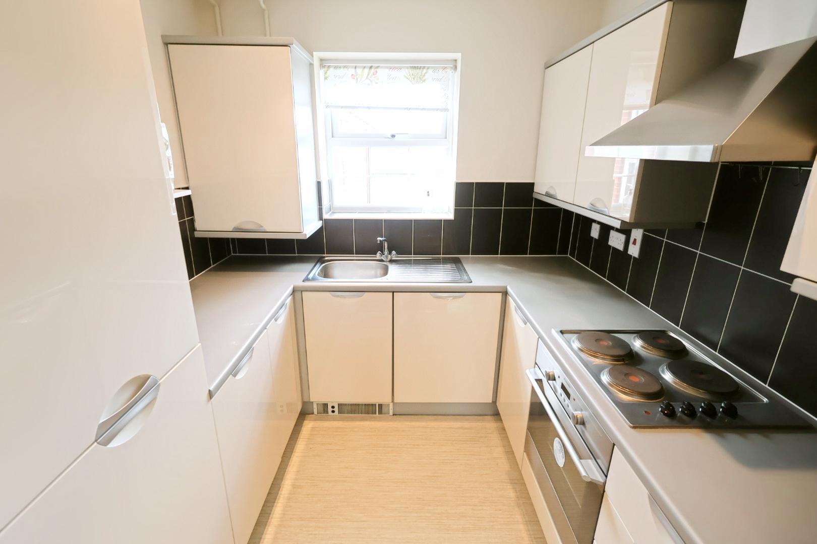 The kitchen is fitted with a range of attractive, contemporary gloss-fronted wall, base, and drawer units, with worktop space incorporating a stainless steel single drainer sink unit with mixer tap and tiled splashback. Integrated appliances include a stainless steel oven, hob, extractor hood, slimline dishwasher, washing machine, and fridge/freezer. There is also a cupboard housing the Ideal Logic gas combination boiler. A window faces the rear elevation, and the ceiling is fitted with recessed downlights and an extractor fan.