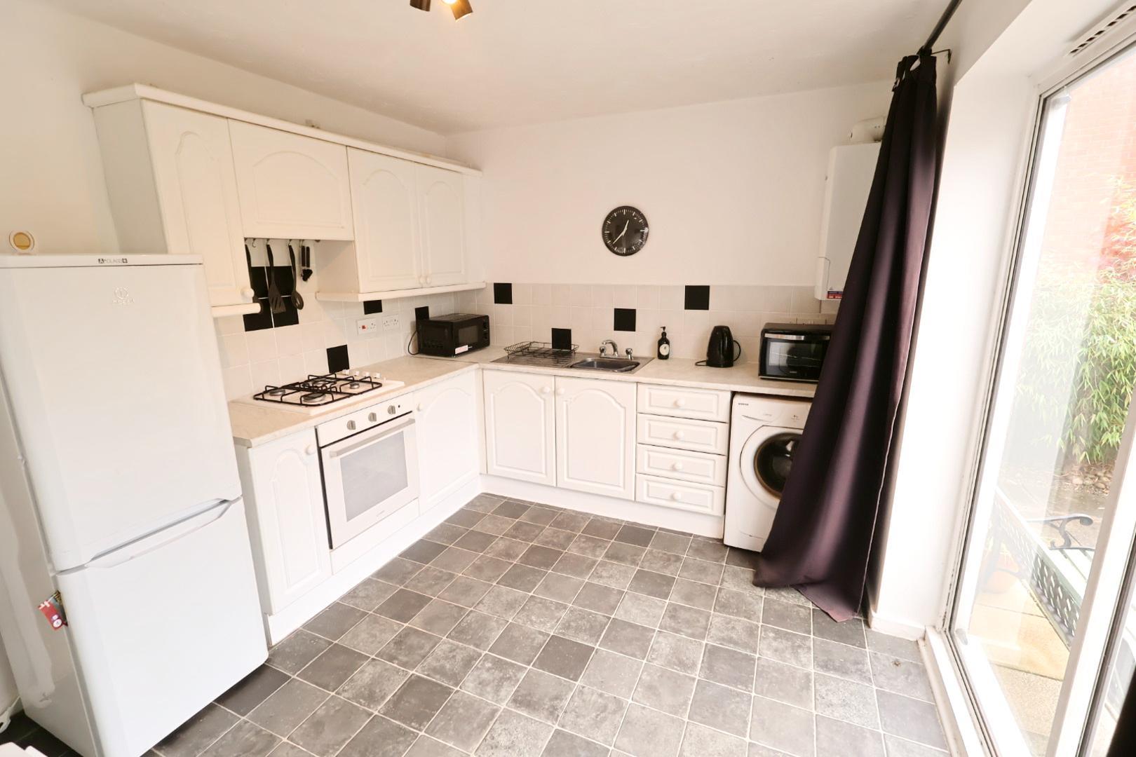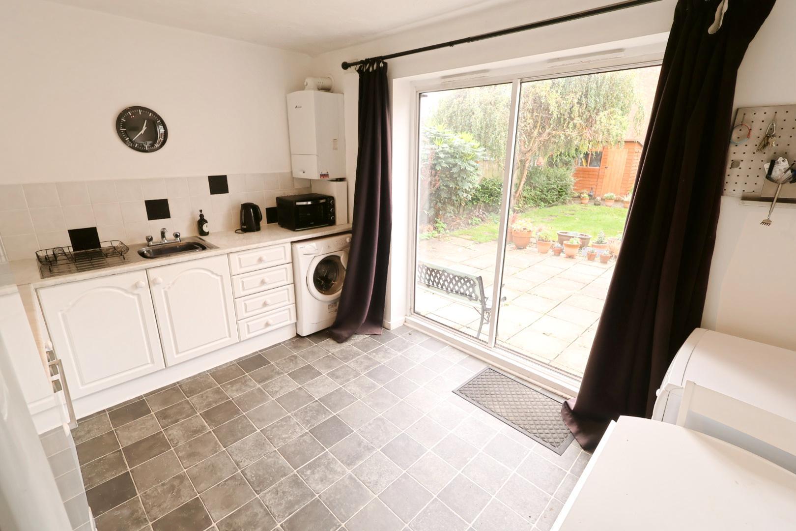 Fitted with a range of white wall, base, and drawer units providing ample work surface space. The kitchen houses a stainless steel single drainer sink with mixer tap and tiled splashbacks. Integrated appliances include an oven, hob, and extractor hood, with space and plumbing for a washing machine. Mounted to the wall is a Worcester gas combination boiler. The room also benefits from a radiator and patio doors opening to the south-westerly facing rear garden and patio area.