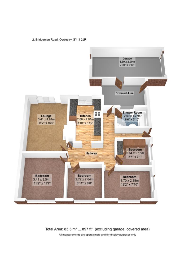 From our Willow Street office proceed out of town, turning right onto Castle Street. Follow the one way system back into the town centre and onto Salop Road. Turn left onto Middleton Road continue straight over the mini-roundabout and then next left onto Brookhouse Road. Follow the road to the end where the bungalow will be found on the corner of the road on the left.