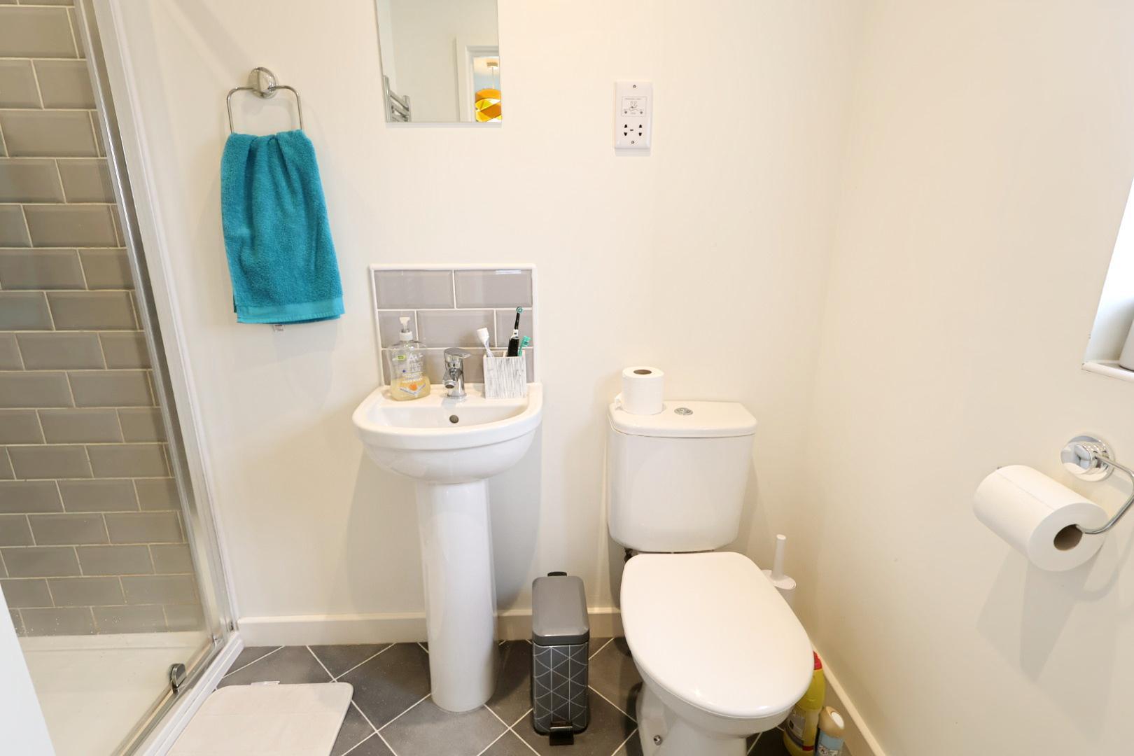 Fitted with a shower enclosure with thermostatic shower, dual flush WC, and pedestal wash hand basin. Partially tiled walls, chrome heated towel rail, extractor fan, recessed downlights, and an opaque window to the side elevation.