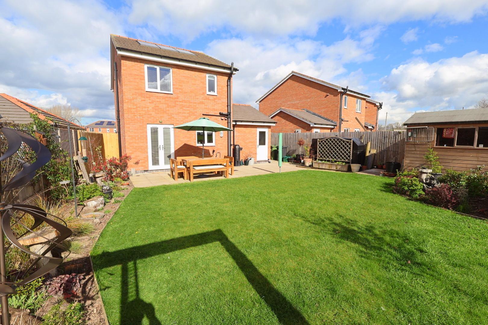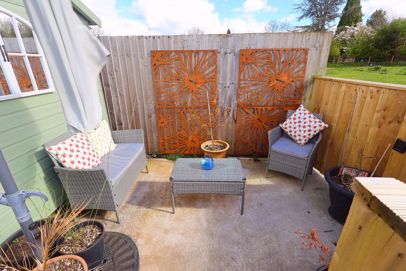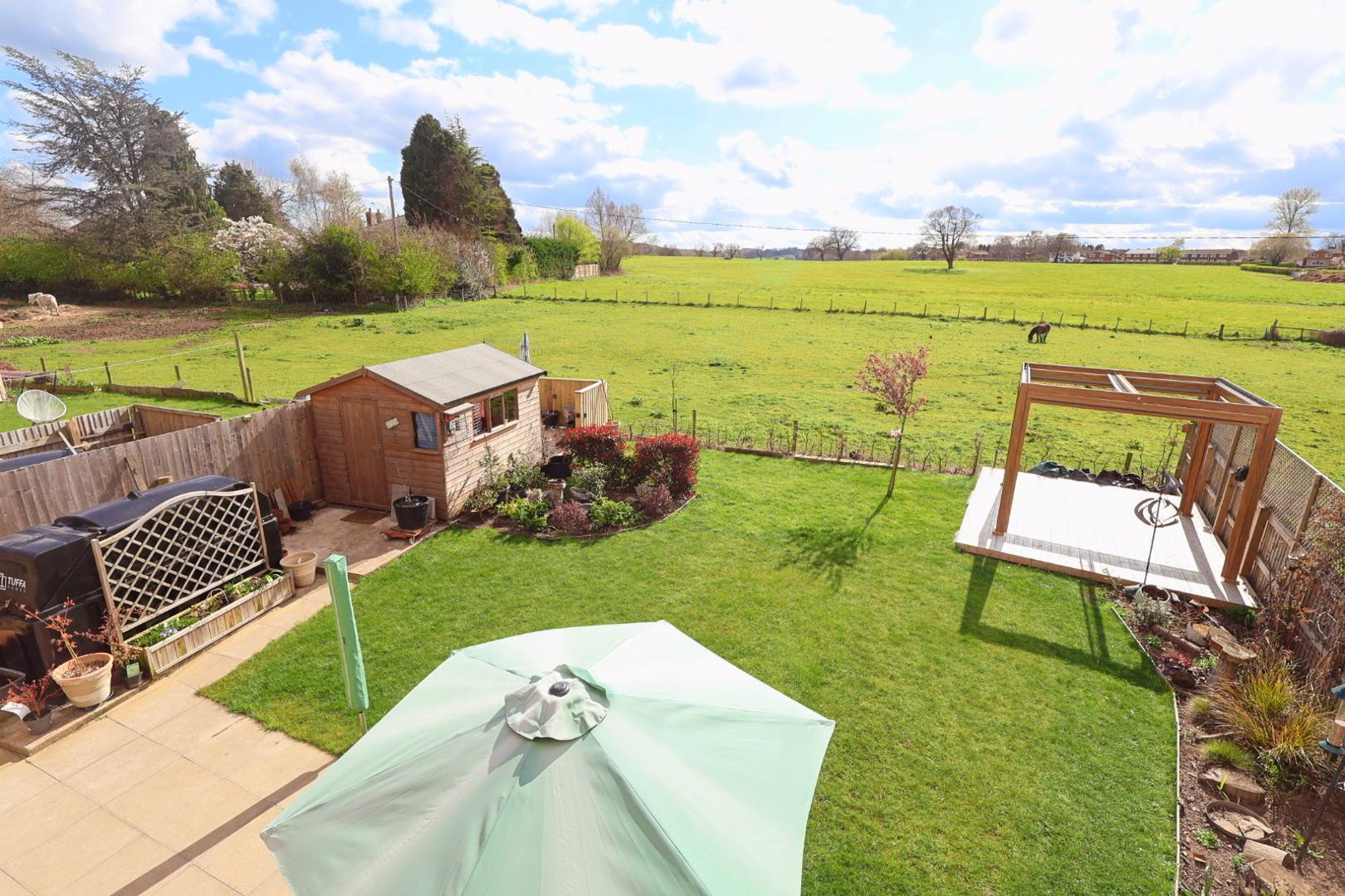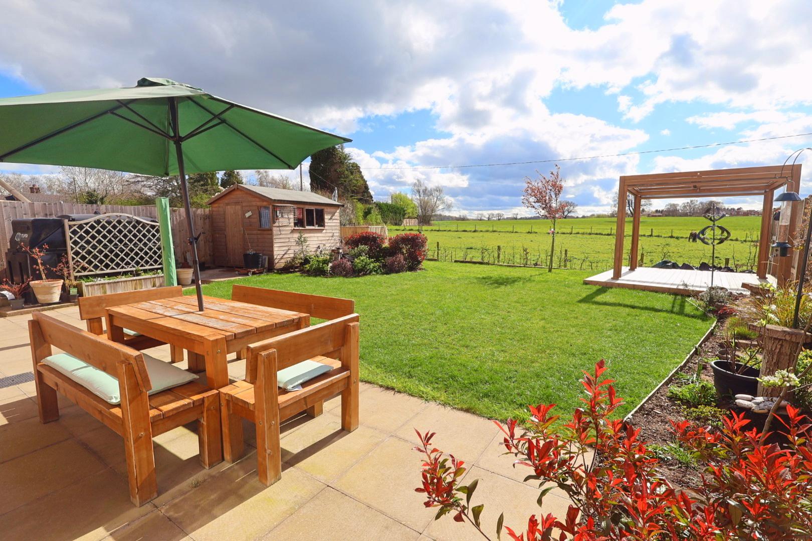 A standout feature of the property, the beautifully presented rear garden enjoys a sunny south-facing aspect with open views over fields. It comprises a well-maintained lawn, a variety of mature plants and shrubs, and multiple seating areas including a paved patio with lighting, water supply and power. There is also a decked patio area with a woodgrain-effect pergola and an additional concrete seating area positioned behind a timber shed.