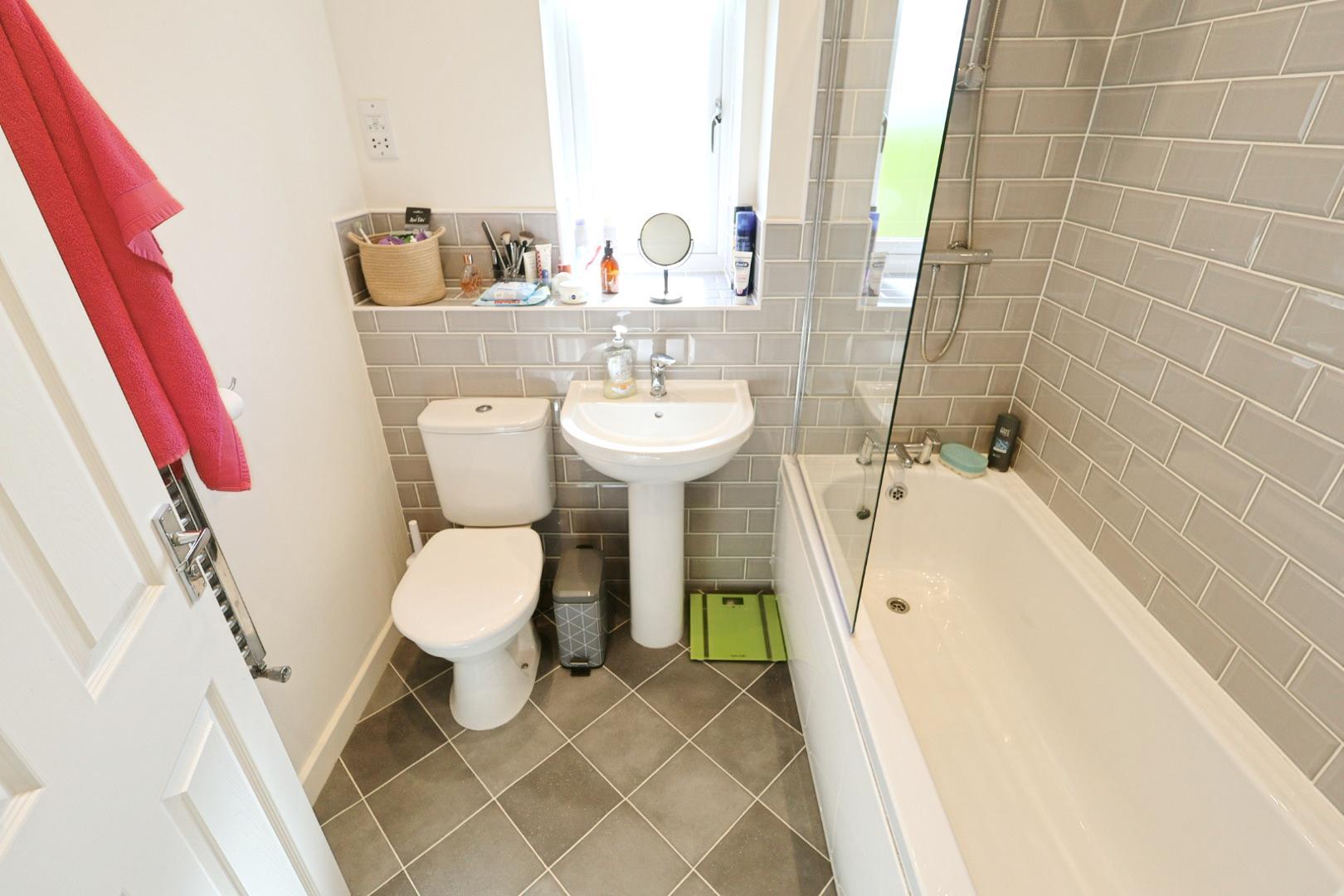 Appointed with a modern white suite comprising a panelled bath with mixer tap and thermostatic shower over, glass screen, dual flush WC, and pedestal wash hand basin. Partially tiled walls, chrome heated towel rail, extractor fan, recessed ceiling downlights, and an opaque rear-facing window.