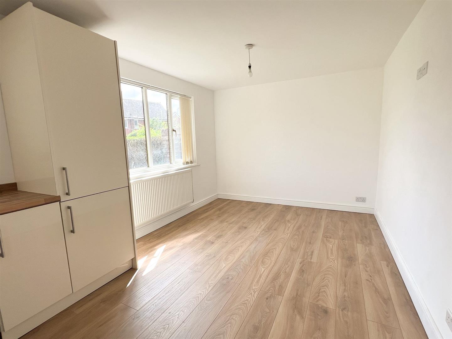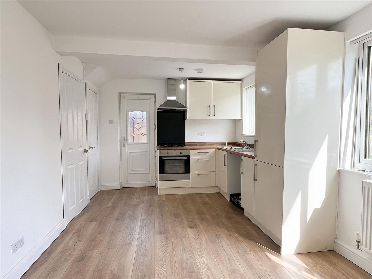 Modern open-plan kitchen/dining area fitted with a range of wall and base units, wood-effect worktops and integrated oven, hob and extractor. Bright and spacious dining area with ample room for a table, benefitting from natural light and wood-effect flooring throughout.