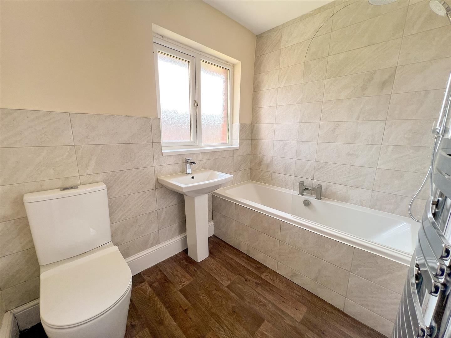 Bathroom fitted with a white suite comprising WC, wash hand basin and bath with shower over. Mainly tiled walls, complemented by a stainless steel heated towel rail.