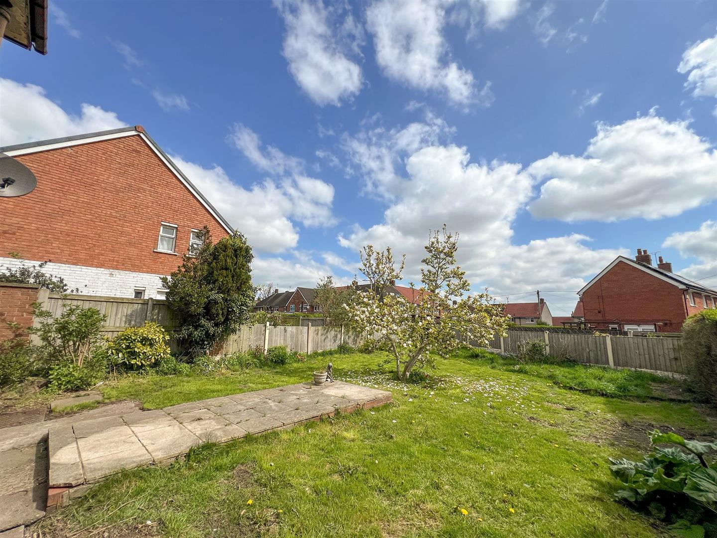 Generous rear garden, fully enclosed with secure fencing, laid to lawn with established shrubs.