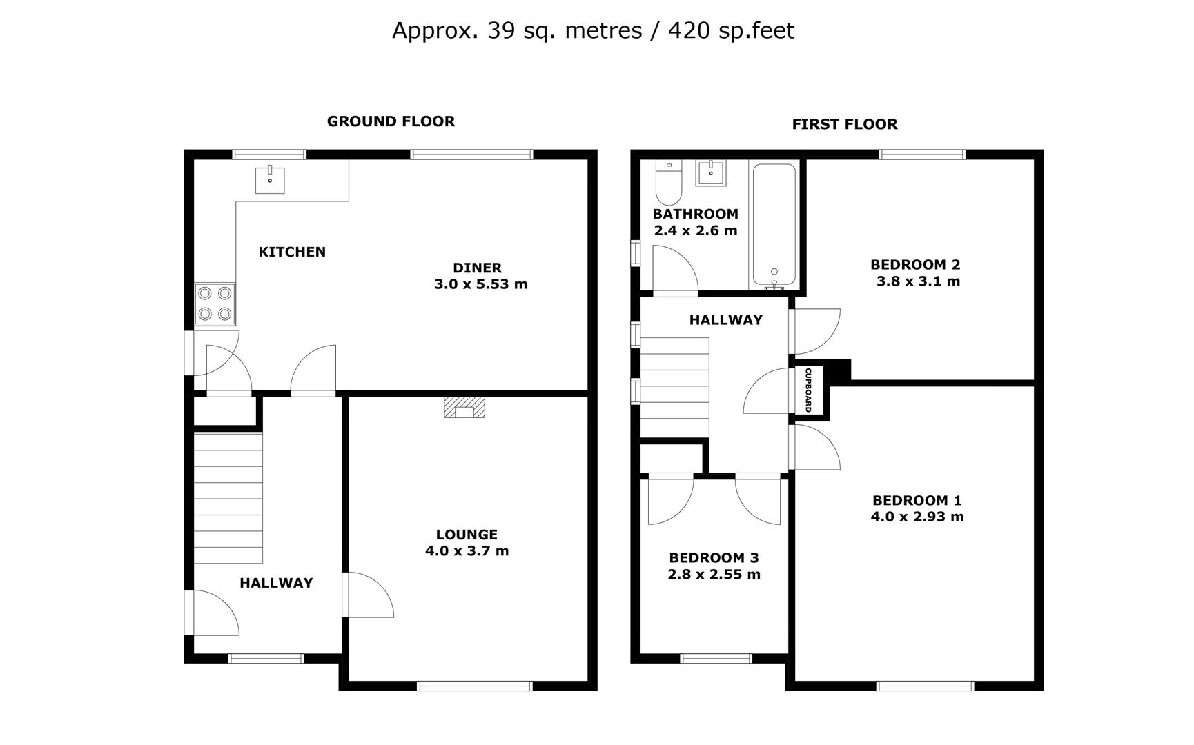Internally, the property comprises a welcoming entrance hall leading to a spacious lounge with a modern inset fireplace, and a contemporary open-plan kitchen/dining area fitted with a range of wall and base units, wood-effect worktops, fitted oven, hob and extractor, with space for a washing machine.