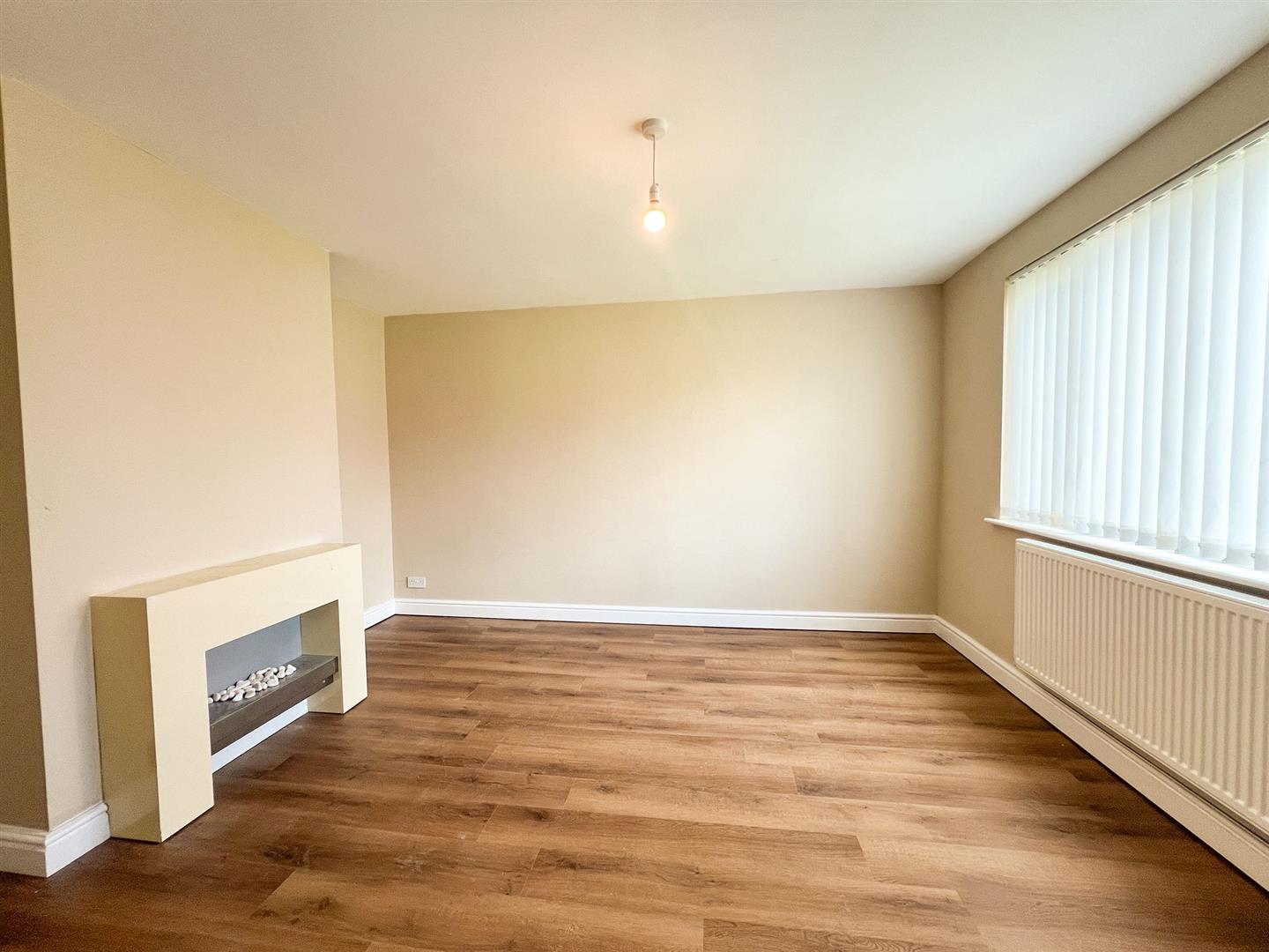 Spacious living room with neutral décor and wood-effect flooring, featuring a modern inset fireplace. Large window provides excellent natural light, creating a bright and comfortable living space.