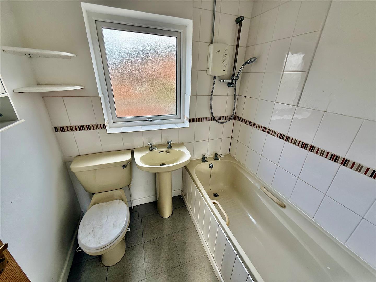 With a window to the rear the bathroom has a W/C, wash hand basin and panelled bath with shower over. Vinyl flooring, part tiled walls and a radiator.