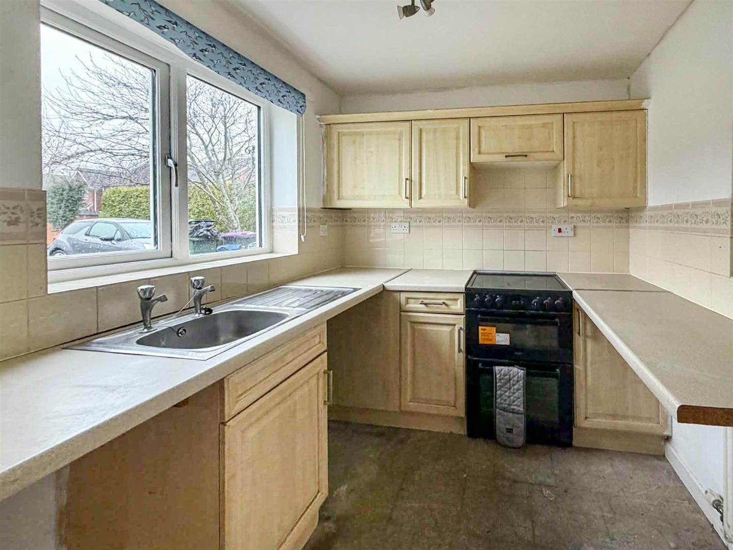 With a window to the front, the kitchen is fitted with a range of base and wall units with work top over, vinyl flooring, window to the front, electric cooker and space for appliances, part tiled walls, stainless steel sink drainer unit, extractor fan and a radiator.