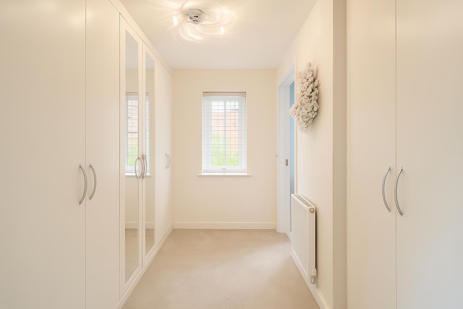 The dressing room is fitted with floor-to-ceiling wardrobes on either side, featuring mirror inserts into the doors. It includes a radiator for comfort, a window facing the rear elevation, and a door that opens into the ensuite bathroom.