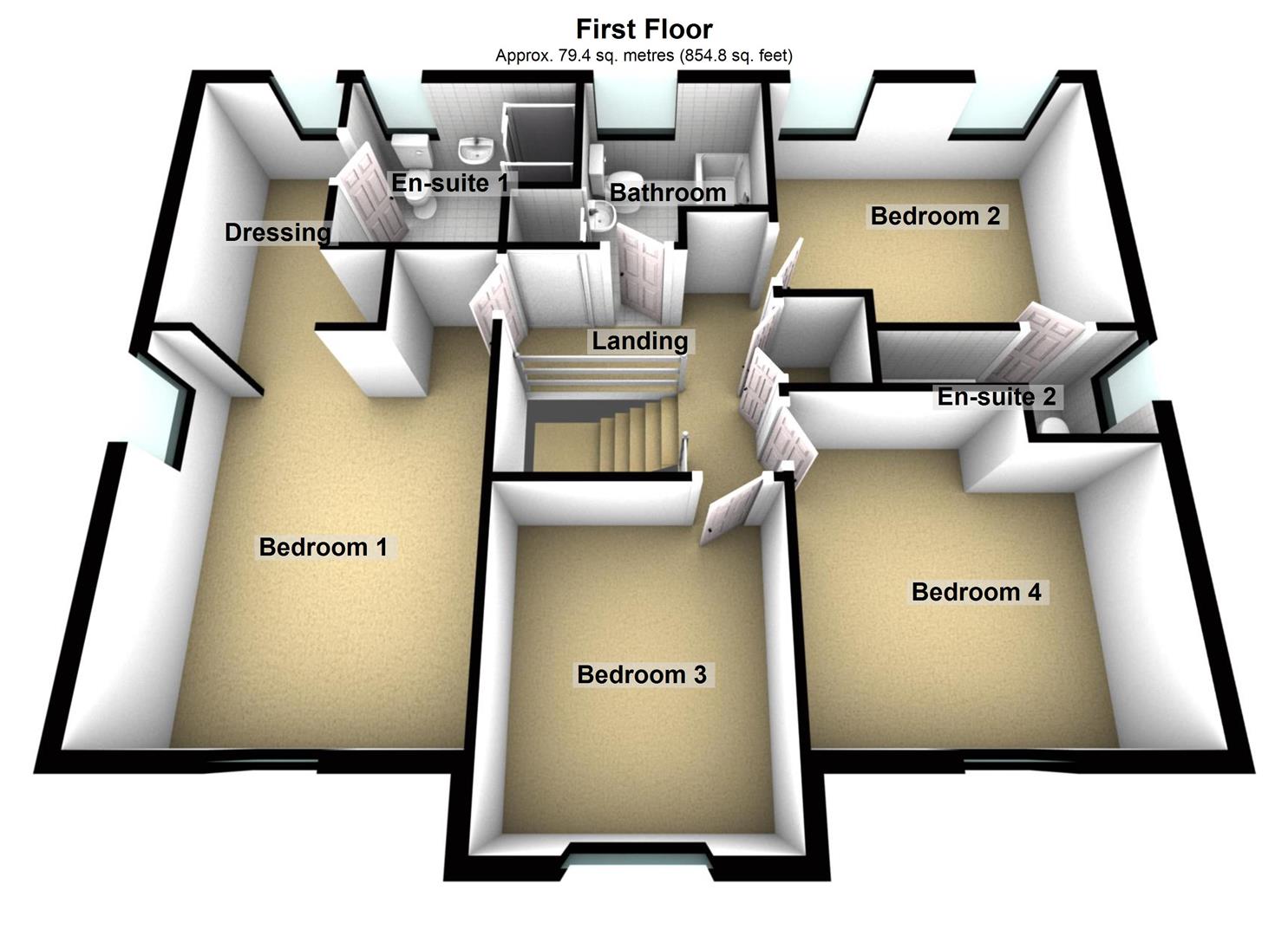The landing continues the spindle balustrades banister from the entrance hall and features a radiator. It includes a built-in double-door cupboard housing the pressurised hot water cylinder. Access to the loft is provided, and there are doors leading to all four bedrooms. The principal bedroom includes a dressing room and an ensuite bathroom, while the guest room features an ensuite shower room.