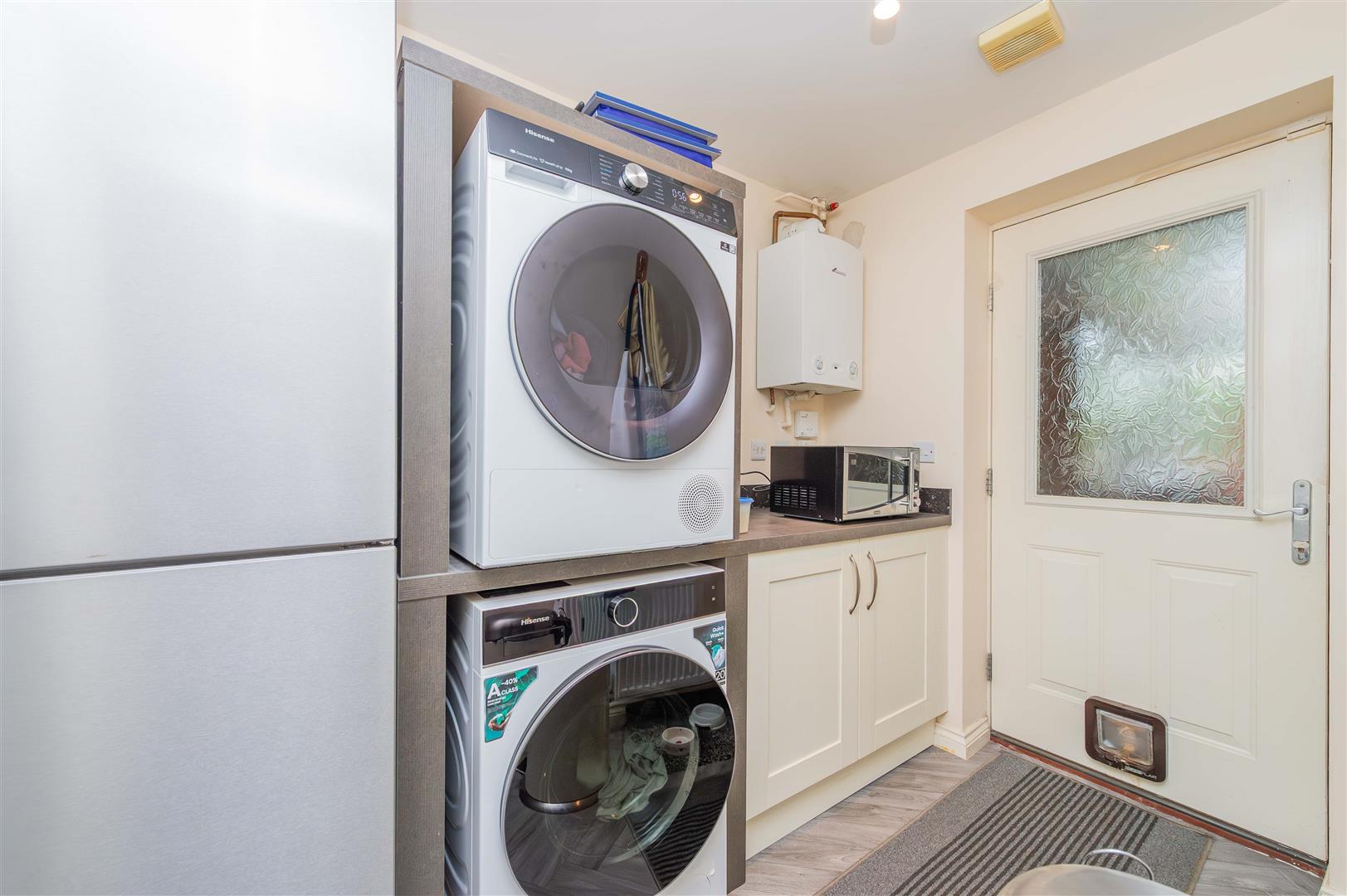 Continuing with a range of base units with work surfaces over, space and plumbing for a washing machine and tumble dryer, vinyl flooring, space for a free standing fridge freezer, Worcester gas fired boiler and extractor fan. A door leads into the garage and a door leads out to the rear garden.