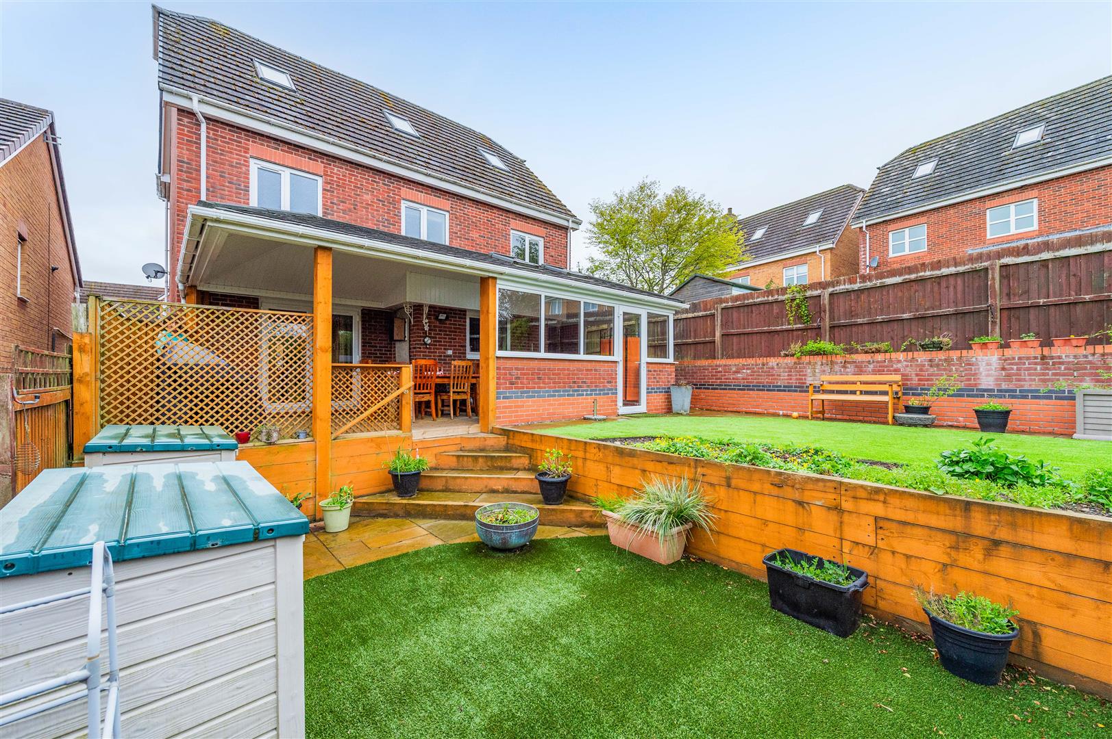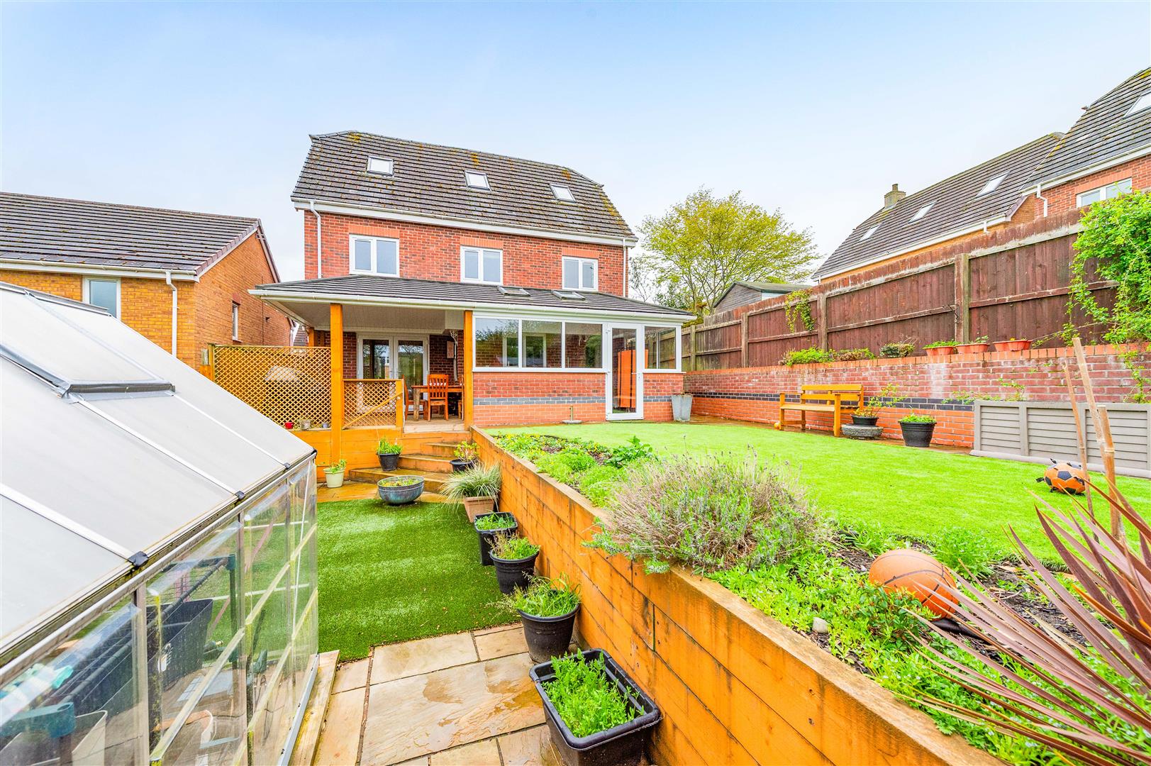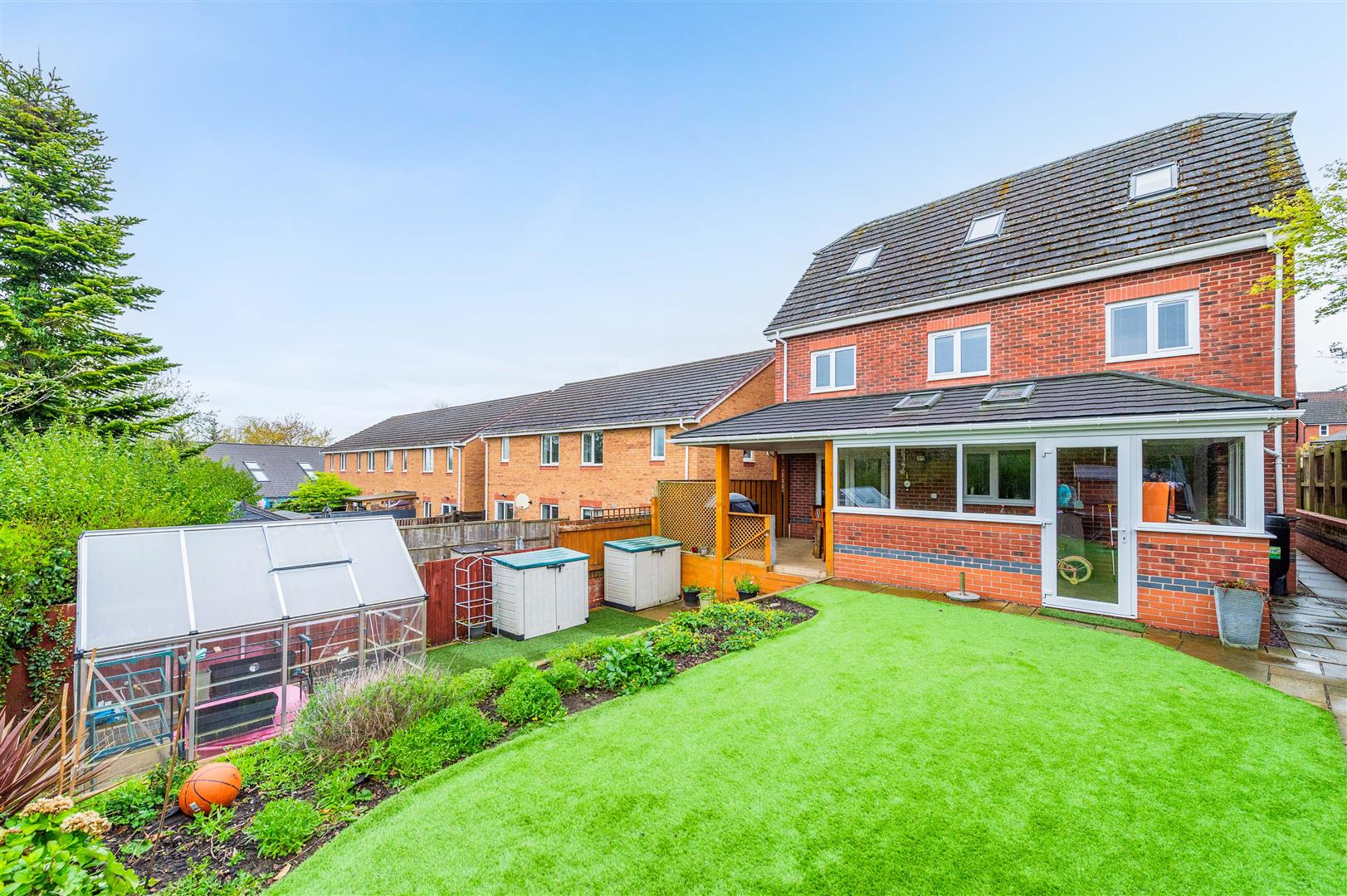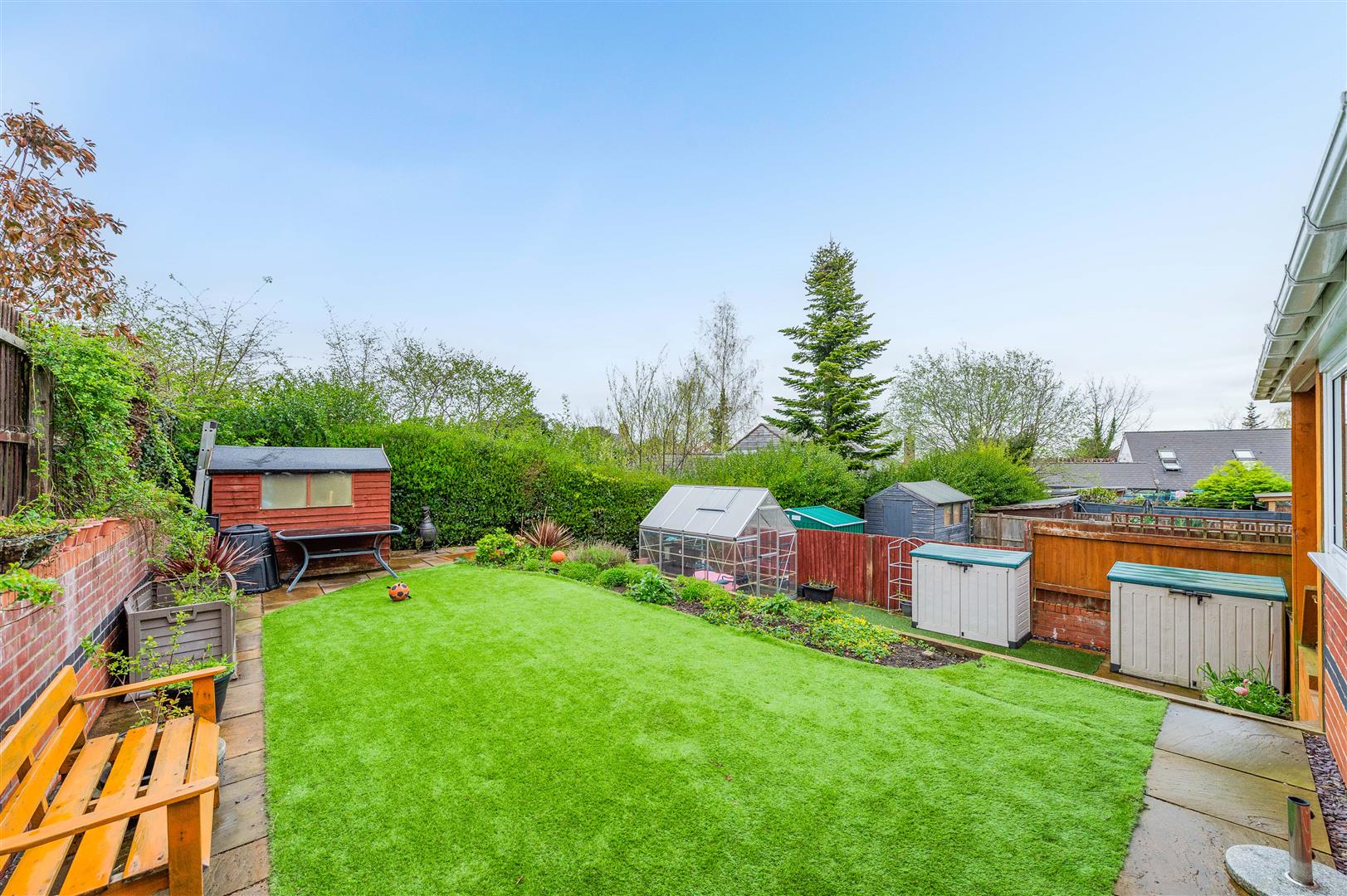 The rear garden is another great feature of this lovely property. There is a paved patio area ideal for entertaining with a lawn area on two levels with artificial grass for low maintenance, partially enclosed by panel fencing and hedgerows. There is a small timber shed and glass greenhouse with planted borders.