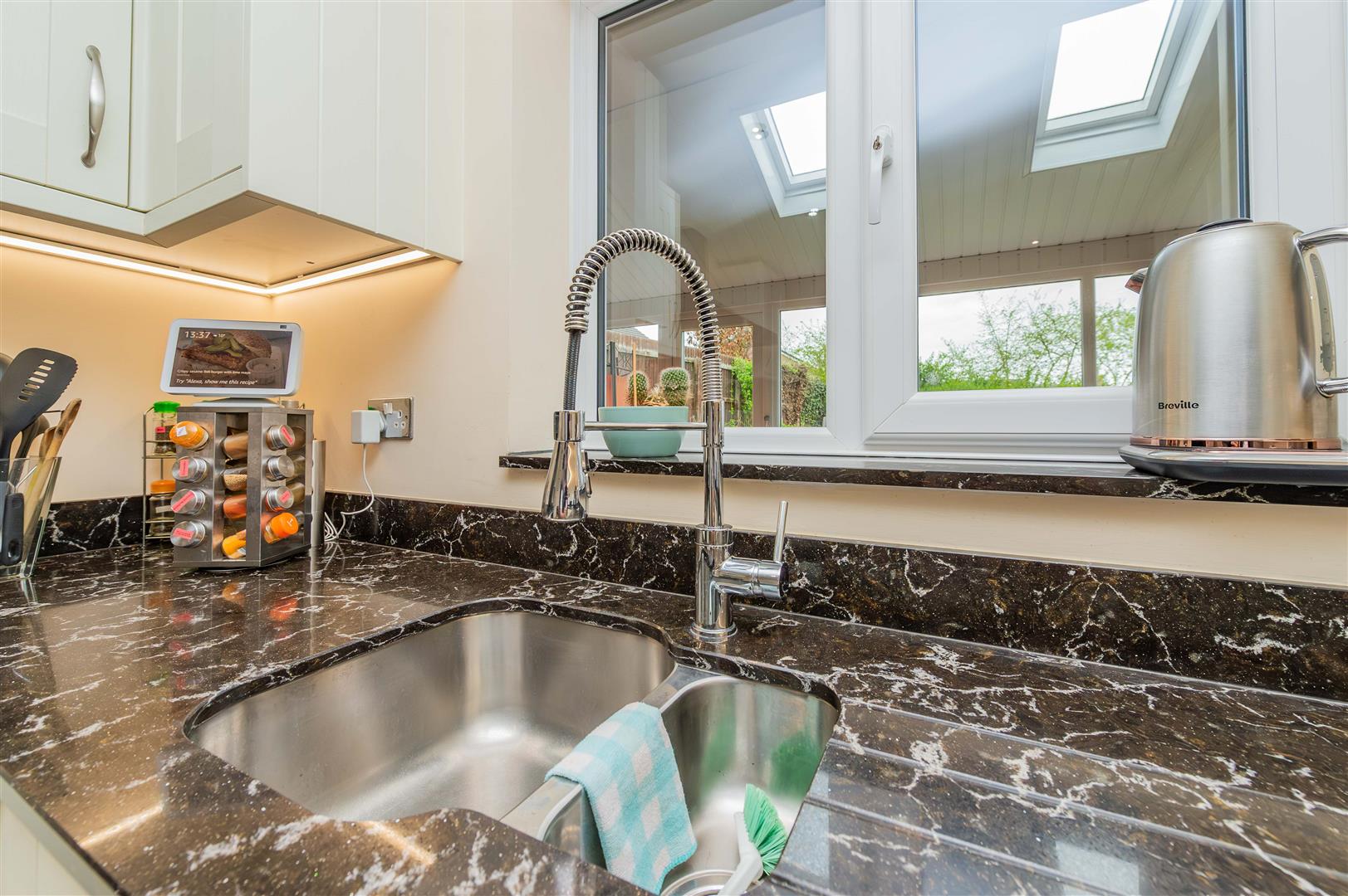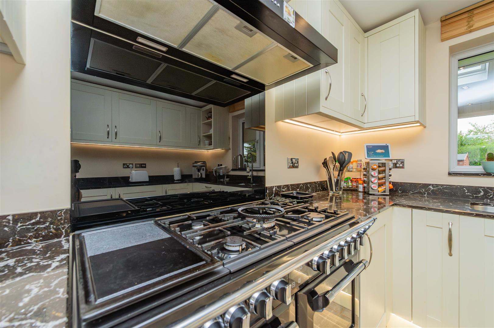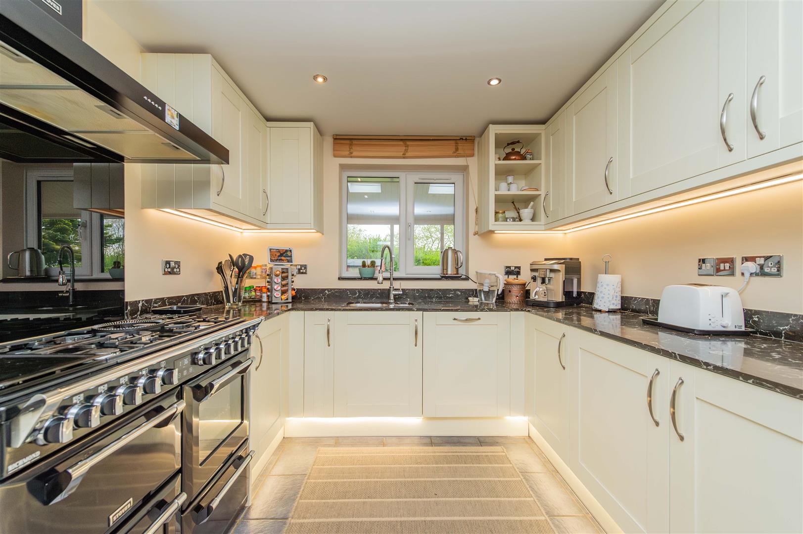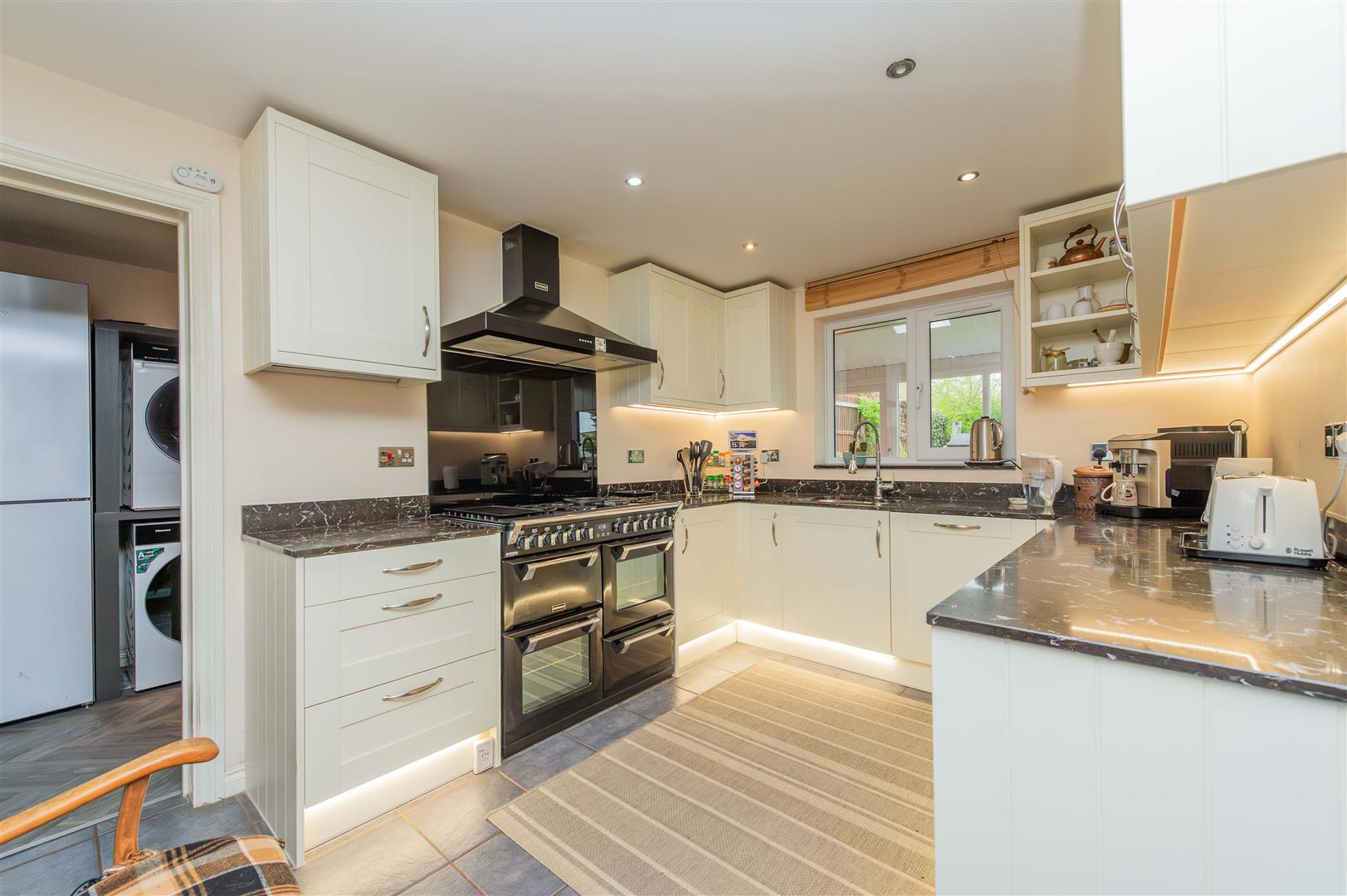 The well appointed kitchen comprises a range of modern floor and wall mounted units with granite worktops over and granite splash back, there are under counter lights and feature plinth lights, 1 1/2 bowl sink with mixer tap over, Richmond Delux double range cooker with a 7 ring gas hob and warming plate, extractor hood over and glass splash back, pull out carousel units and an integrated AEG dishwasher. A window looks out over the rear garden and there is tiled flooring, radiator and spotlighting.