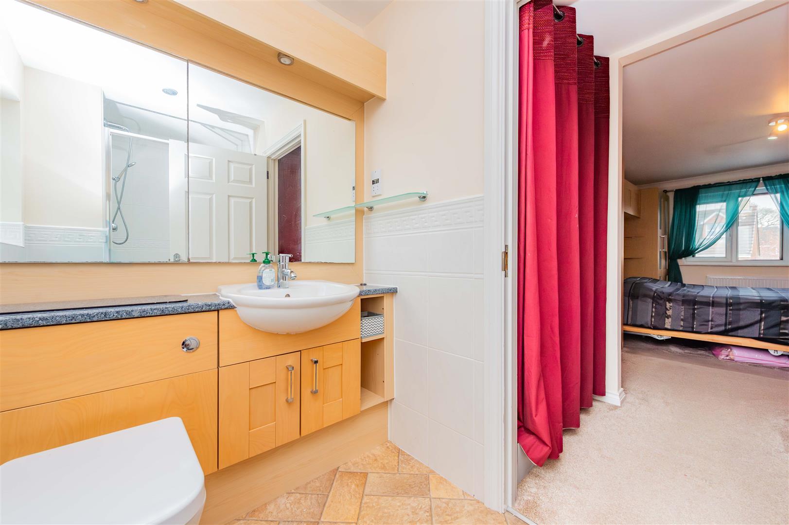 The ensuite comprises a cubicle shower with mains powered shower, WC and wash hand basin on a vanity unit, part tiled walls, vinyl flooring, spotlights to the ceiling and a large vanity mirror with down lights.