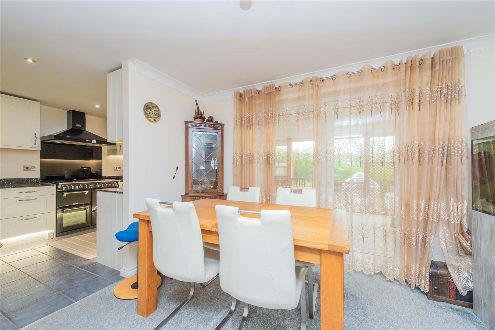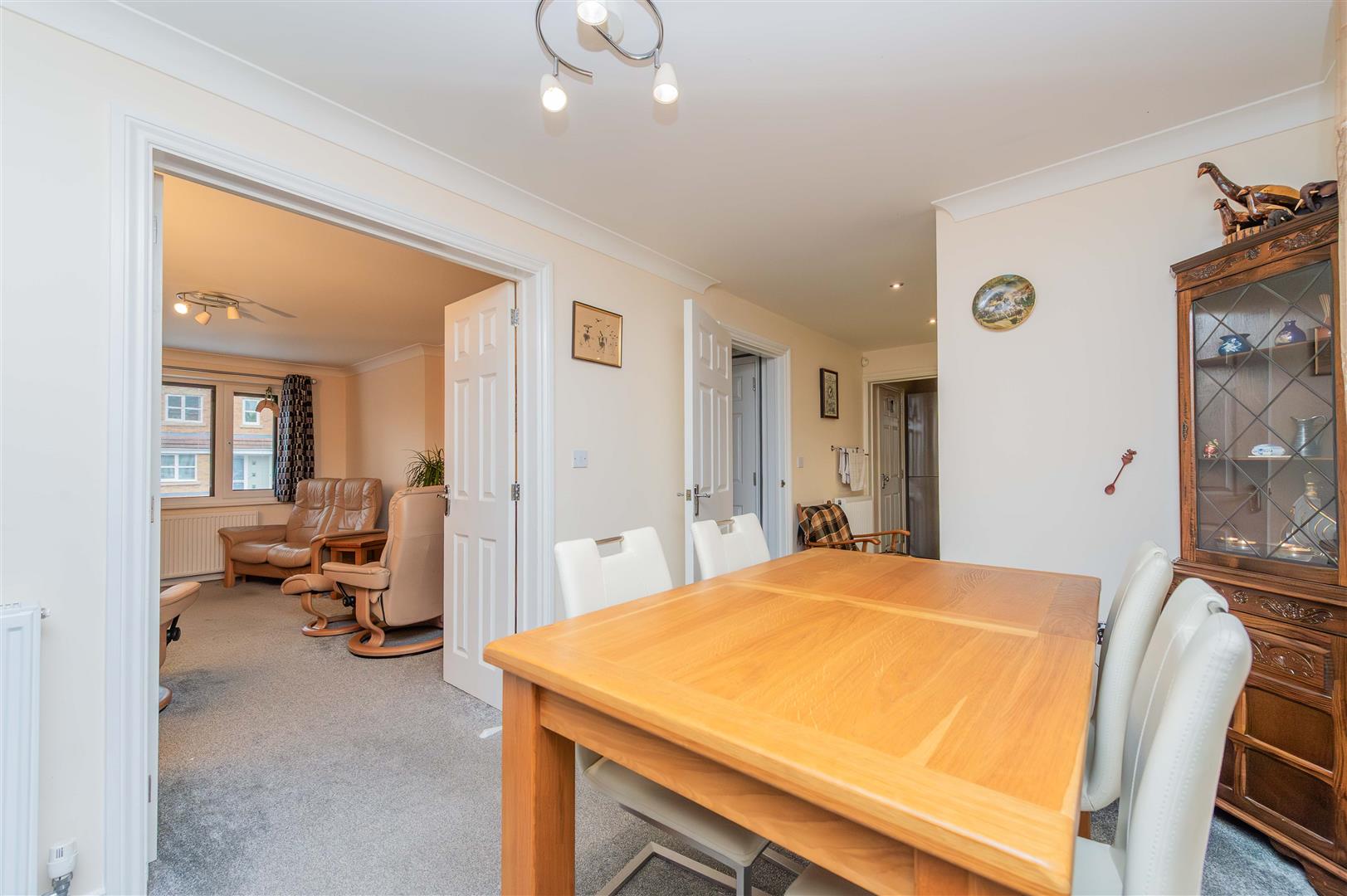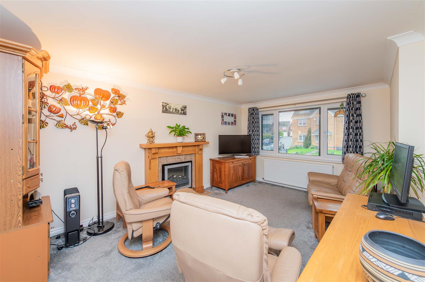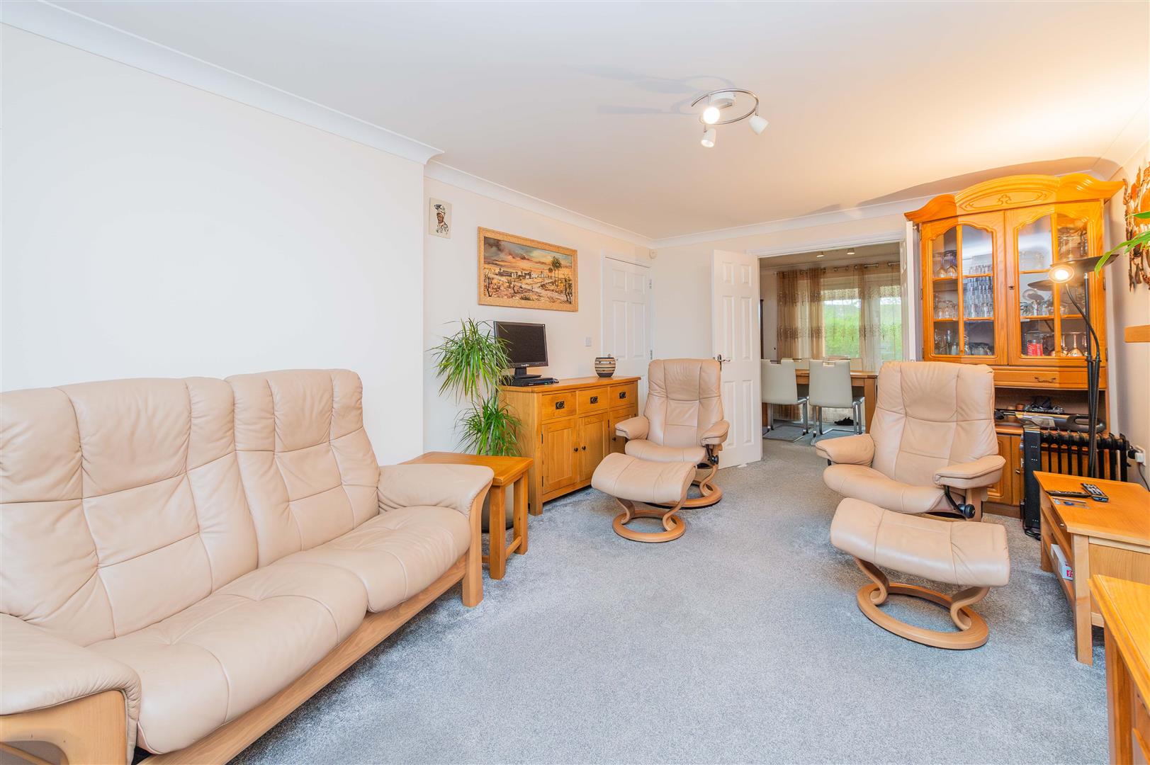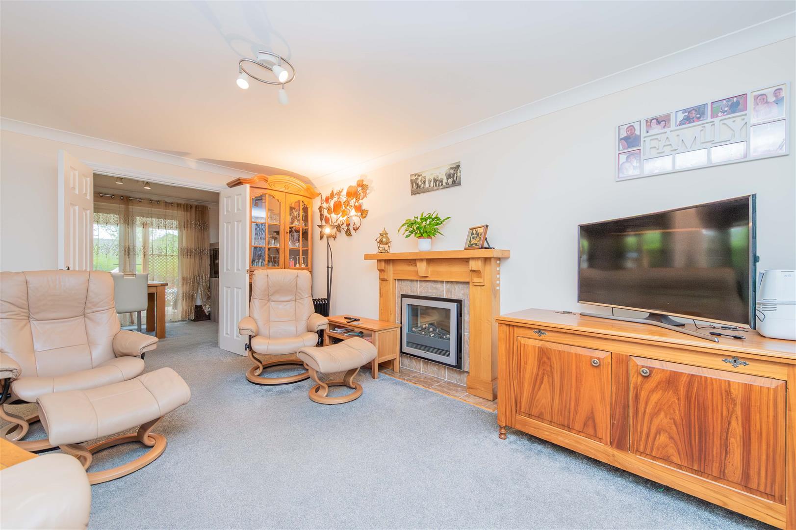 This very light and spacious living room has a window to the front with tilt and turn mechanism and integrated blinds, double doors that lead into the dining room, coved ceiling, feature electric fireplace with oak surround and a tiled hearth, Internet & TV points.