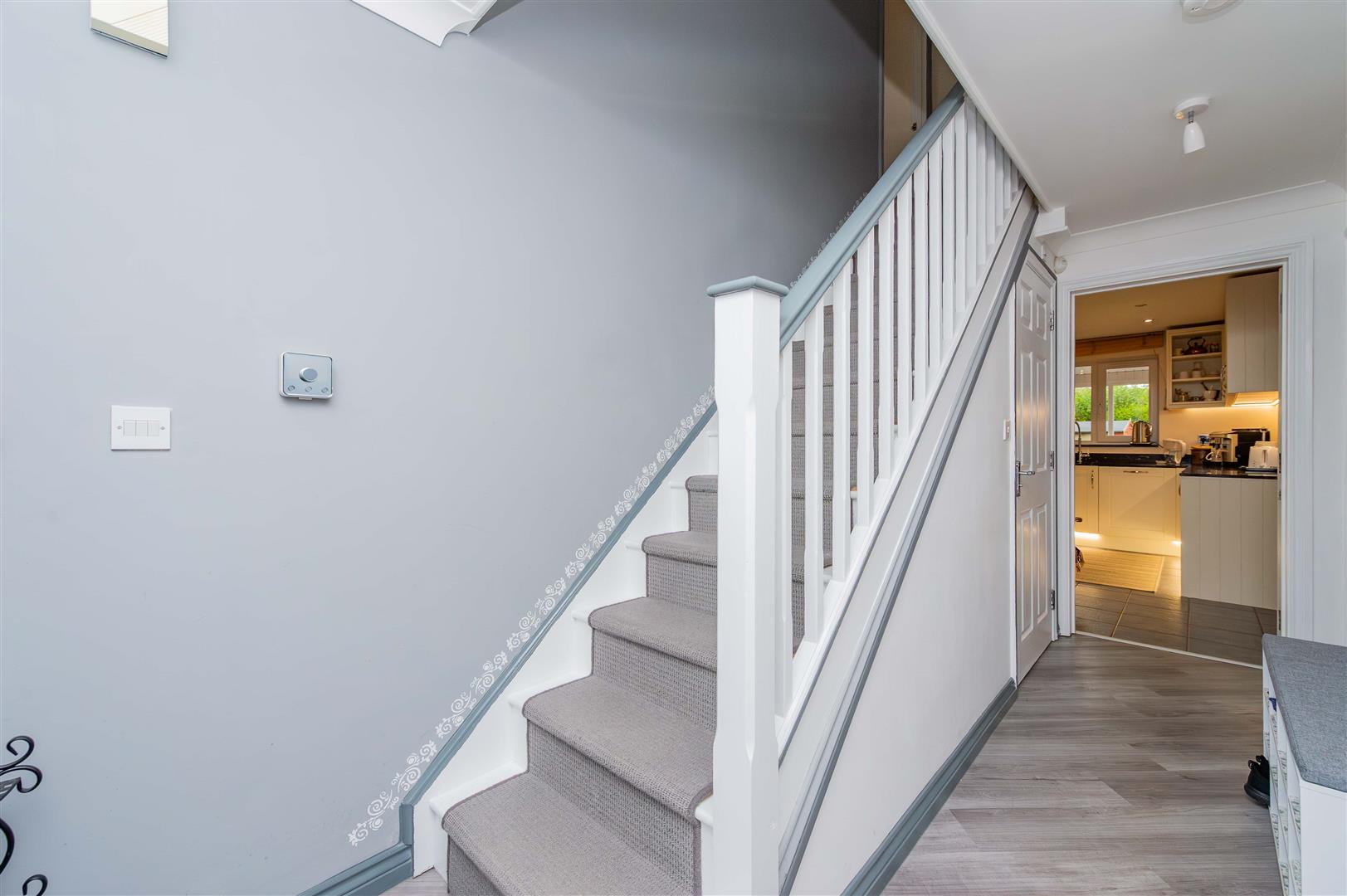 The property is accessed via a part glazed door and side panel to the front into the hallway which has stairs leading to the first floor landing, coved ceiling, thermostat controls and doors to the downstairs WC, lounge and the kitchen..