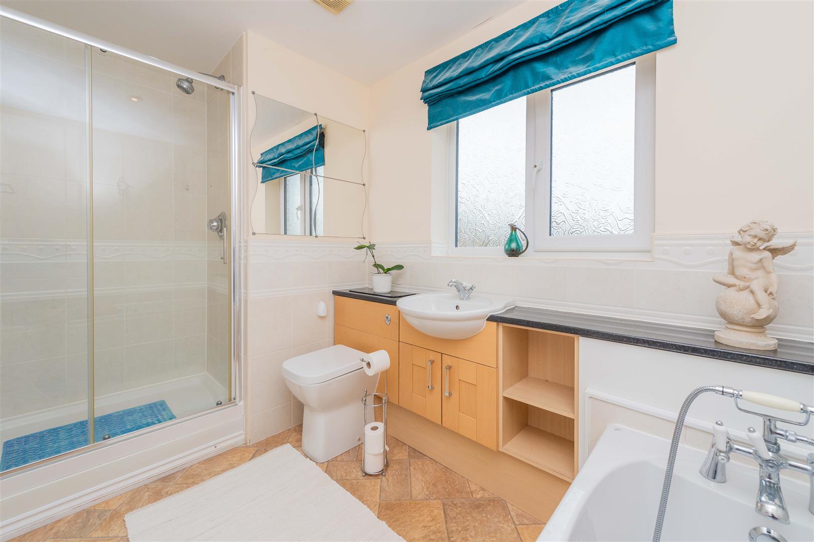 The family bathroom comprises a panel bath with mixer tap and shower head over, double shower cubicle with mains fed shower attachment, WC and wash hand basin on a vanity unit. Part tiled walls, vinyl flooring, extractor fan and spotlighting.