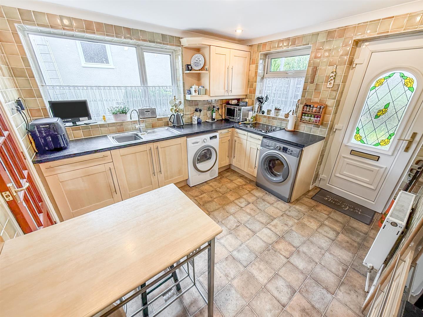 The bright, well proportioned kitchen/ breakfast room is fitted with a good range of base and wall units with work surfaces over, tiled flooring, two radiators, electric oven, plumbing for appliances, stainless steel sink with a mixer tap over, four ring hob, extractor fan, windows to the front and the side, space for a fridge/ freezer and a part glazed door which leads to the front of the property.