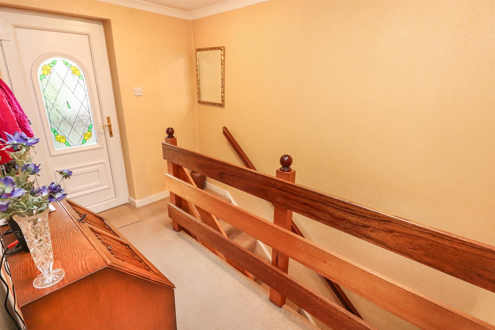 The bright hallway comprising of an upstairs cloak room and toilet with washbasin, has stairs that lead to the ground floor bedrooms and bathroom and doors that lead to the kitchen, cloakroom and the lounge. There is a radiator and a part glazed door to the front.