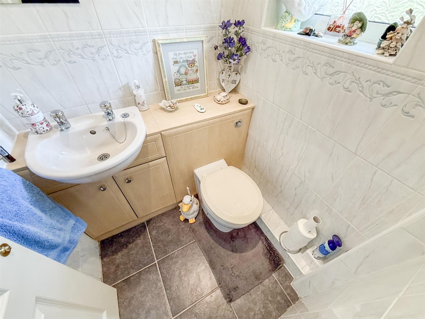 The upstairs cloakroom has a wash hand basin on a vanity unit, fully tiled walls, W/C on a vanity unit, a window to the front, spotlighting, coved ceiling and tiled flooring.