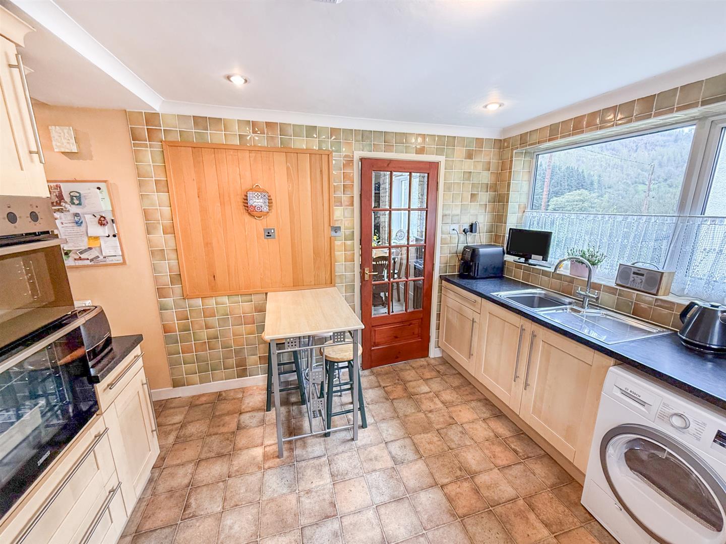 A lovely sized reception room that has windows to the front and the side that take in the fabulous views over the Ceiriog valley and the hills beyond. There is a feature fireplace with marble surround and an inset electric fire, wall lights, radiator and a door leading through to the kitchen.