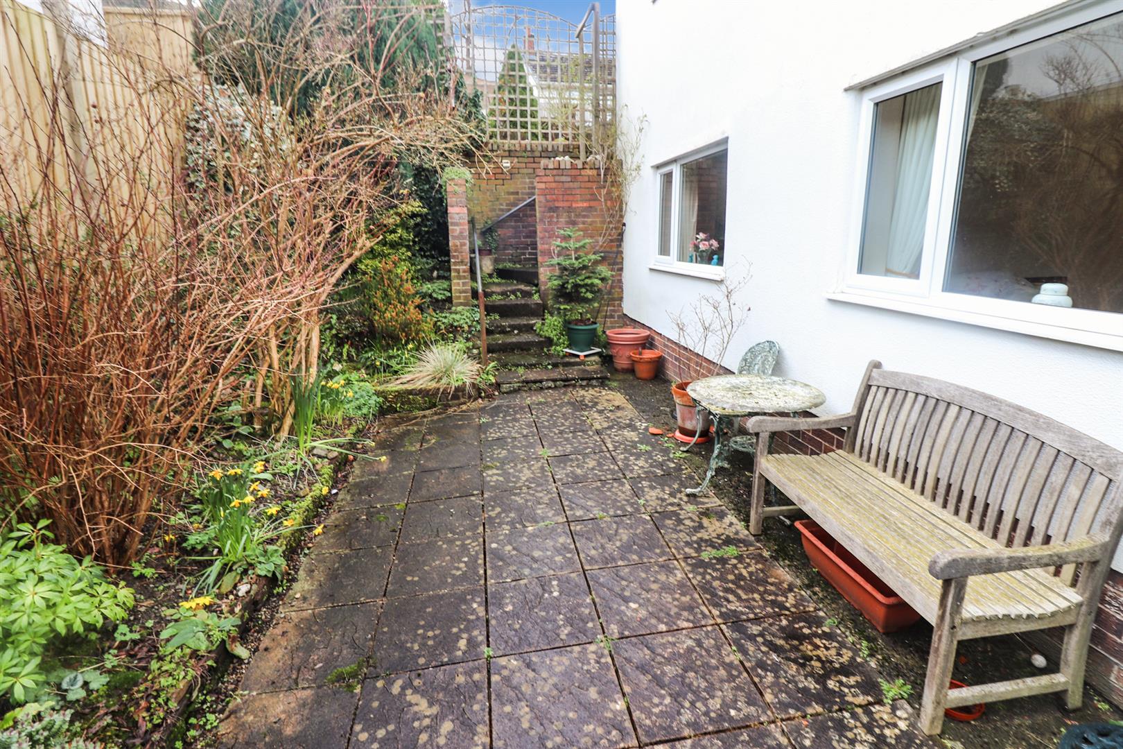 To the front of the property there is a driveway leading to the garage, pathway leading to the front door and gated access to the rear enclosed garden on each side of the property. There is a shrubbed and paved garden to the front with a low wall boundary.