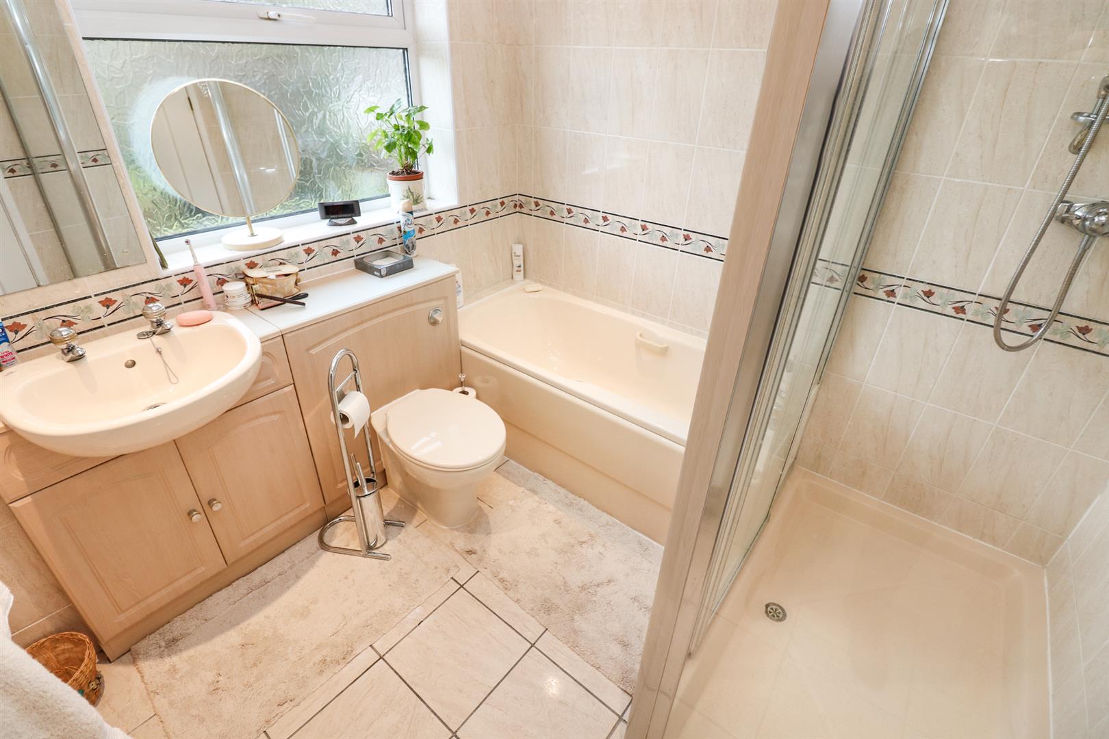 The well appointed modern bathroom has tiled flooring, panelled bath, separate shower cubicle, a window to the rear, wash hand basin and low level W.C on vanity units shaver point, tiled walls, and a heated towel rail.
