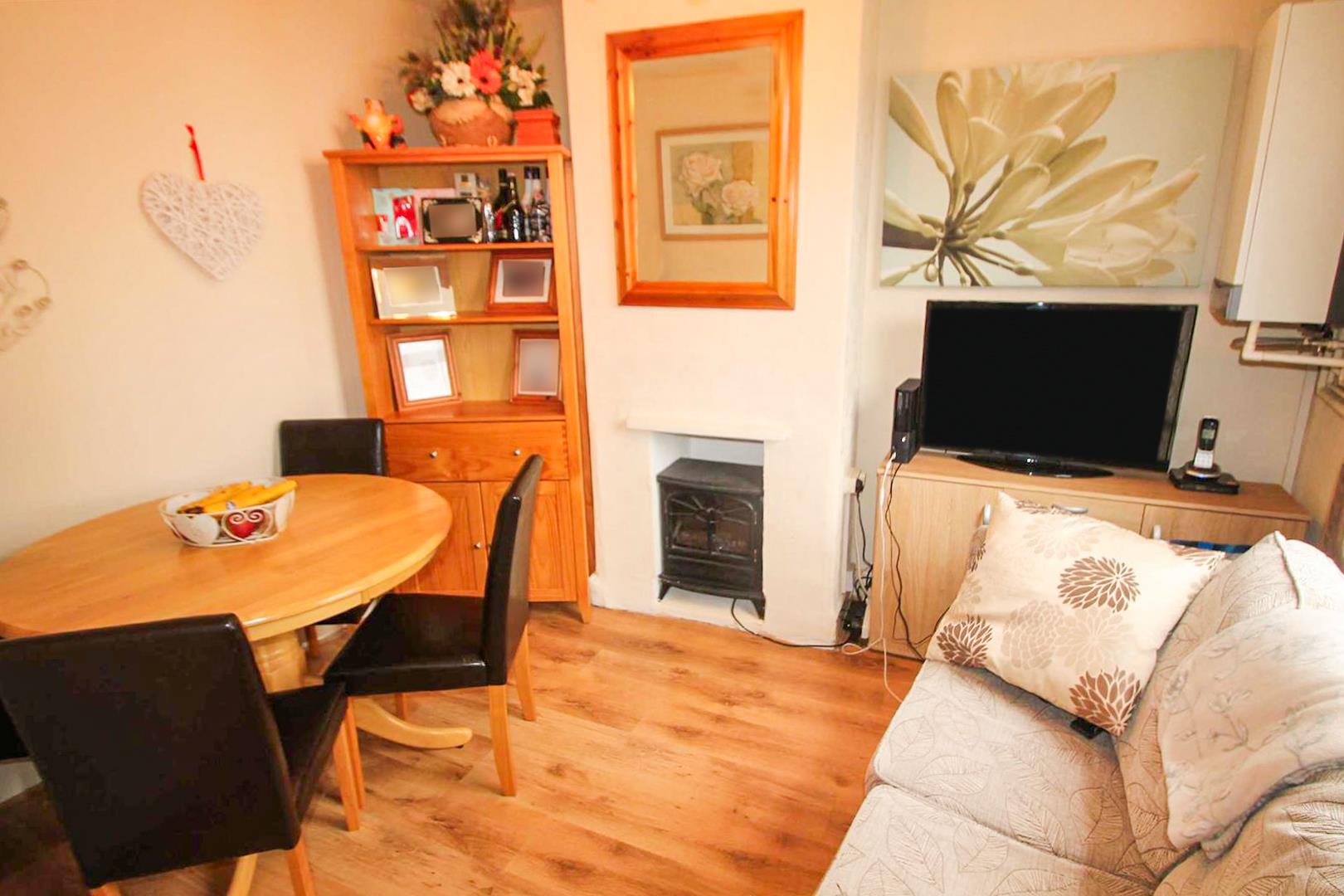 To the rear there is shared access and steps leading up to a lawned area, decked area to the rear with views across to the castle remains, fence panelling encloses the garden.