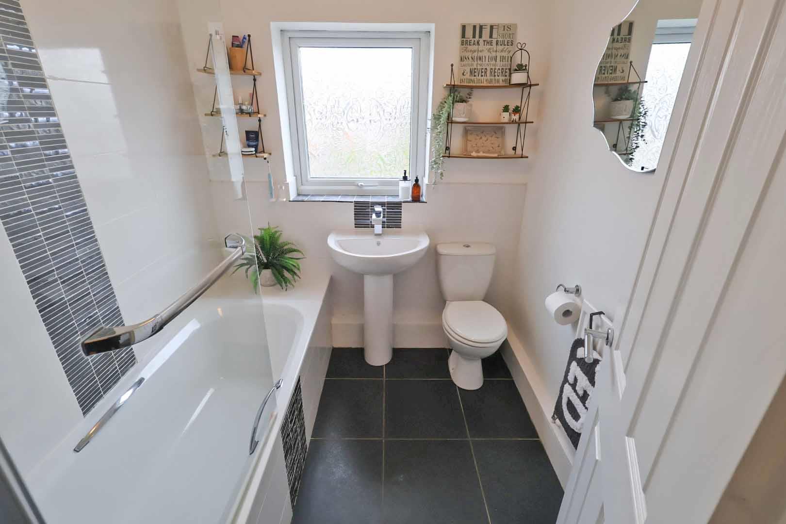 Appointed with a modern white suite comprising a panelled bath with electric shower and glass screen above, a dual-flush low-level WC, and a pedestal wash hand basin with mixer tap. There is a ceramic tiled floor, partially tiled walls, a radiator, and an opaque window to the rear elevation.